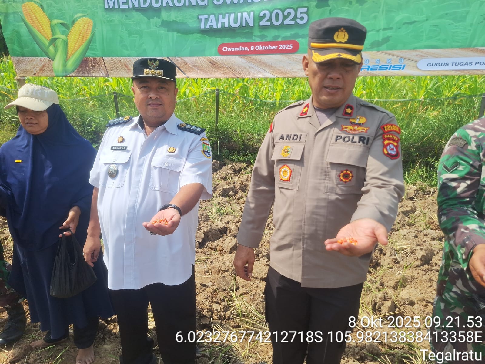 Cilegon - Dalam Rangka Mendukung Asta Cita Presiden Republik Indonesia Tentang Ketahanan Pangan,secara Serentak Penanaman Jagung Kapolsek Ciwandan KOMPOL Andi Suherman Dan Forkopimcam Kecamatan Ciwandan Turun Langsung ke lahan Penanaman jagung secara Serentak Bersama Personil Dan masyarakat, Rabu (08/10/2025).