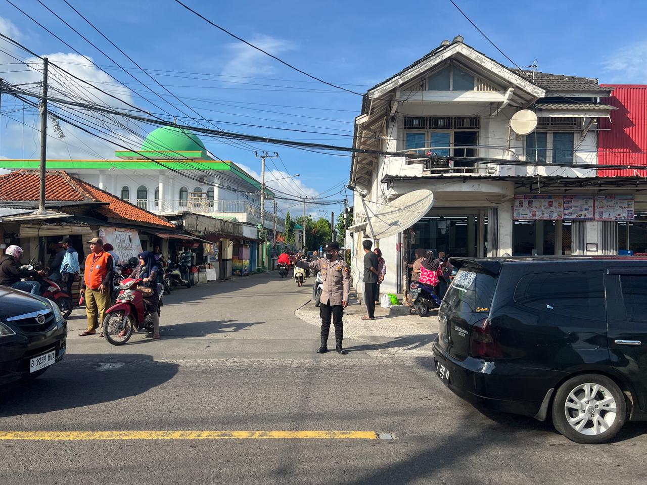 Anggota Siwas Polres Cilegon melaksanakan Pengaturan Arus Lalin atau Gatur Strong Point di arah jalur Wisata Pantai Anyer Banten.