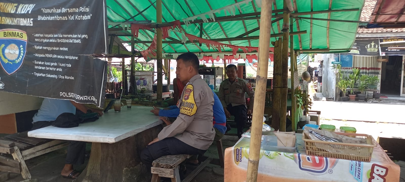 Bhabinkamtibmas Kelurahan Kotabumi, Polsek Purwakarta, Polres Cilegon, bersama dengan Kanit Bimas IPDA Surahman, melaksanakan kegiatan sambang dan silaturahmi dengan warga di sebuah warung kopi di Link. Leuweungsawo Kelurahan Kotabumi Kecamatan Purwakarta