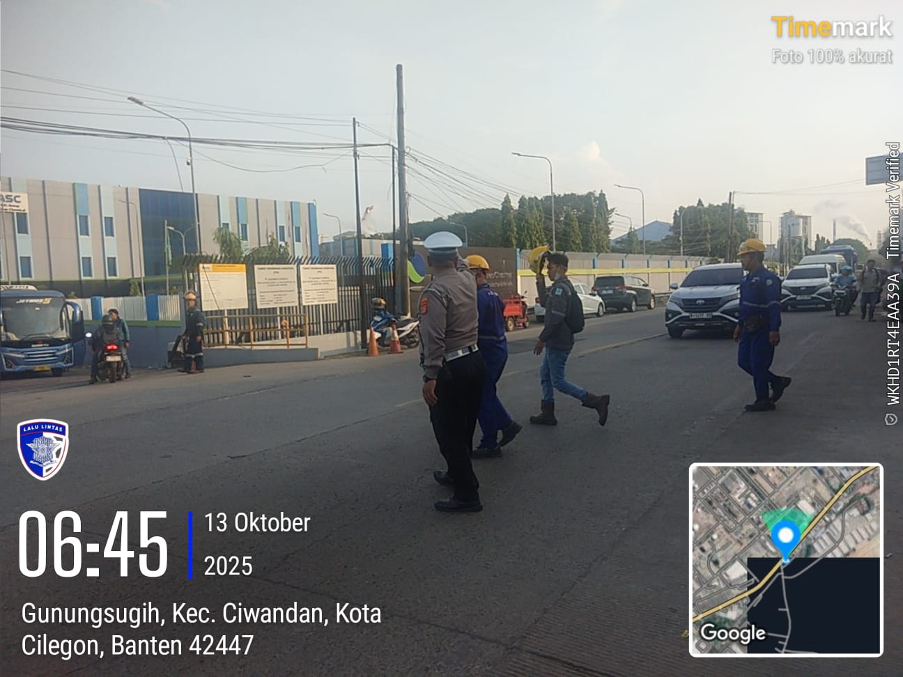 Cilegon - Personil  Polsek Ciwandan Polres Cilegon Polda Banten melaksanakan giat Strong Poin Pengaturan Lalu Lintas Disimpang Brown Kelurahan Gunung Sugih guna menciptakan ketertiban, keamanan dan Kelancaran Lalu-lintas bagi masyarakat, Senin (13/10/2025).