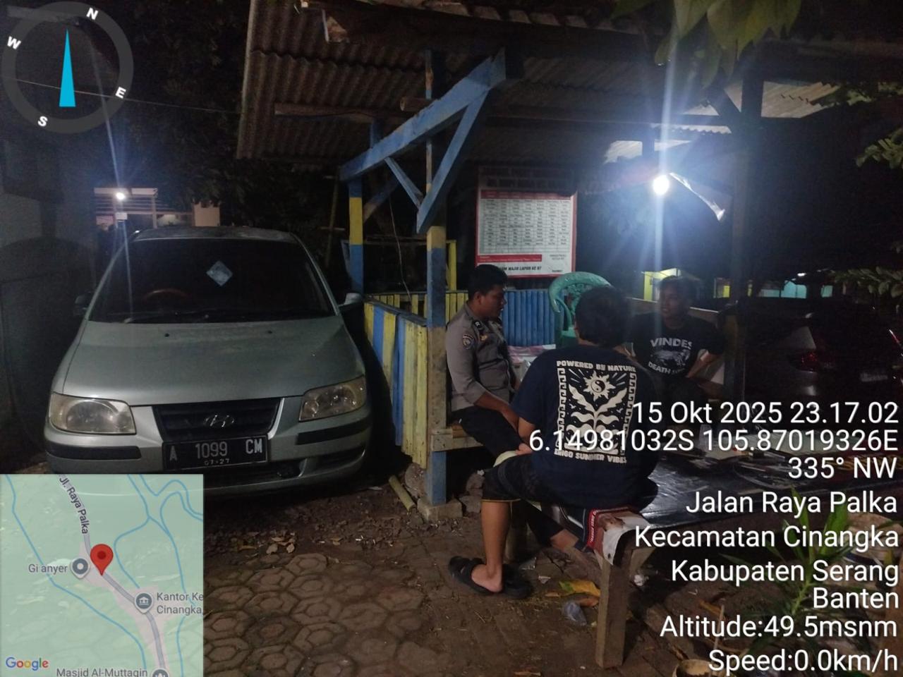 *Polres Cilegon* || Personil Bhabinkamtibmas Polsek Cinangka melaksanakan Program Komandan Wish Kapolda Banten RONDA SATKAMLING menyampaikan komunikasi dengan Petugas Siskamling agar berperan aktif dalam menciptakan Harkamtibmas yang aman dan Kondusif, Kamis (16/10/2025).