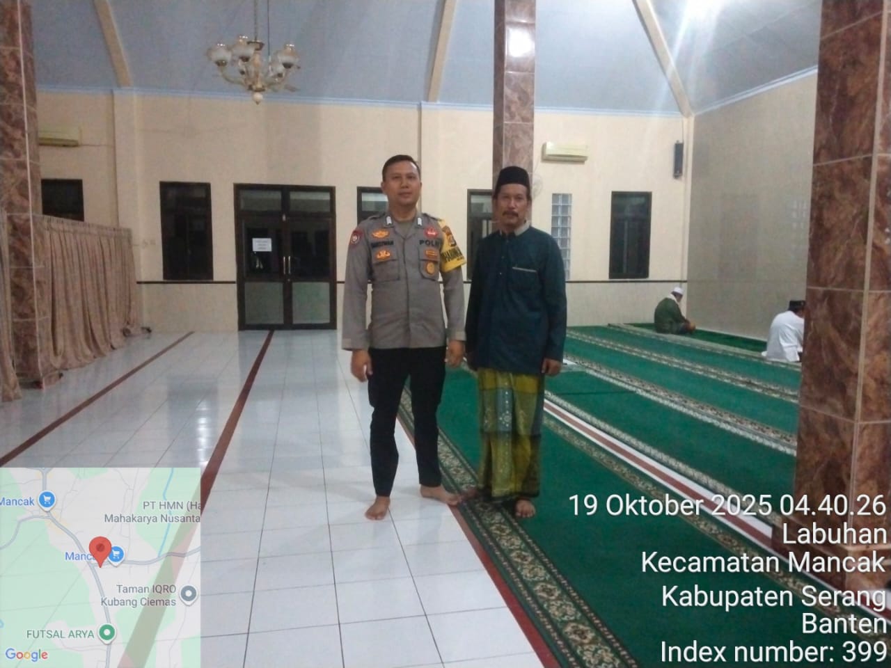 Kapolres Cilegon Polda Banten AKBP Dr. Martua Raja Taripar Laut Silitonga melalui Anggota Polsek Mancak BRIPKA DARSIWAN melaksanakan Program Comander Wish Kapolda Banten "SUBLING" Shalat Subuh Keliling di Masjid At-Tawuun Ds. Labuan Kec. Mancak Kab. Serang. Kegiatan Sholat Subuh berjamaah ini dimaksudkan agar Polisi dapat bersilaturahmi dan berbaur bersama masyarakat dan alim ulama dengan menjalin Kedekatan dan kemitraan sehingga dapat bersinergi dengan masyarakat dalam Harkamtibmas demi terciptanya situasi yang aman dan kondusif di Daerah Hukum Polsek Mancak.