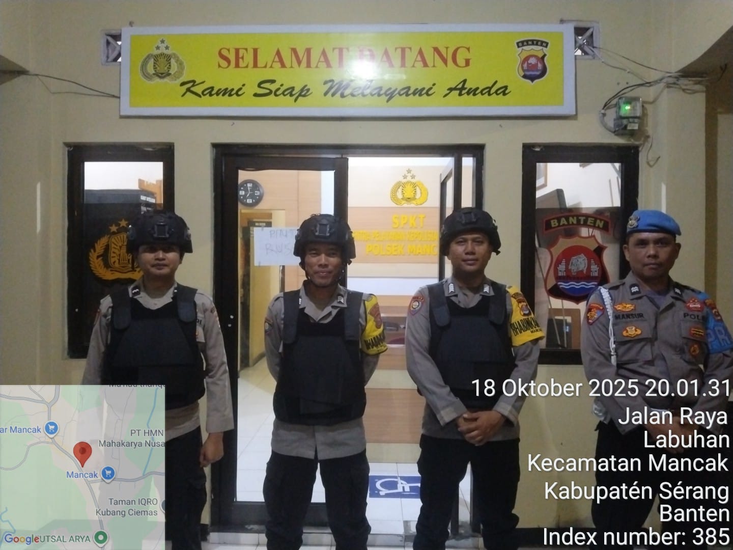 “Anggota piket jaga Polsek Mancak AIPTU FANA S, AIPDA HERMAN, AIPDA PESTA, BRIPKA DARSIWAN,BRIGADIR AGAM. Melaksanakan Sispam Mako dilengkapi dengan bodyvest, helm kevlar, dan senjata api  serta melakukan dan ini salah satu upaya peningkatan kemanan mako guna mencegah hal-hal yang tidak dapat di duga selama pelayan berlangsung.”