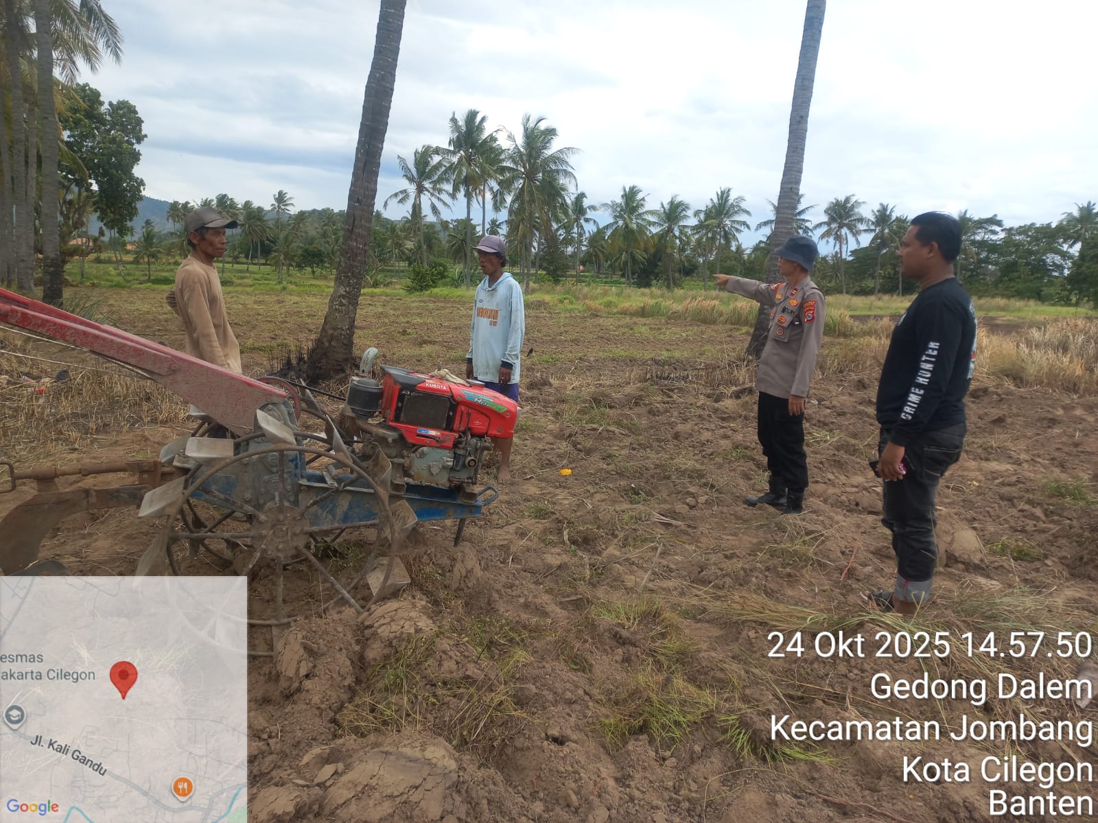 Cilegon - Melaksanakan program pemerintah, penanaman jagung dalam program ketahanan pangan, personil Polsek Kp Merak Polres Cilegon Polda Banten melaksanakan kegiatan peninjauan serta monitoring lokasi yang nantinya akan ditanami bibit jagung unggul di Desa Mangkunegara Kecamatan Bojonegara, Kabupaten Serang, Jumat (24/10/2025).