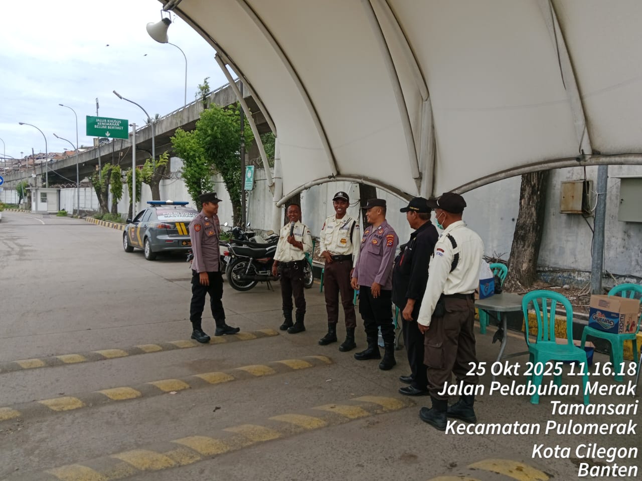 Cilegon - Personel Polsek Kskp Merak Polres Cilegon Polda Banten melaksanakan sambang dan patroli kawasan pelabuhan merak dalam rangka menjaga Harkamtibmas di Kawasan Pelabuhan Merak, Sabtu (25/10/2025).