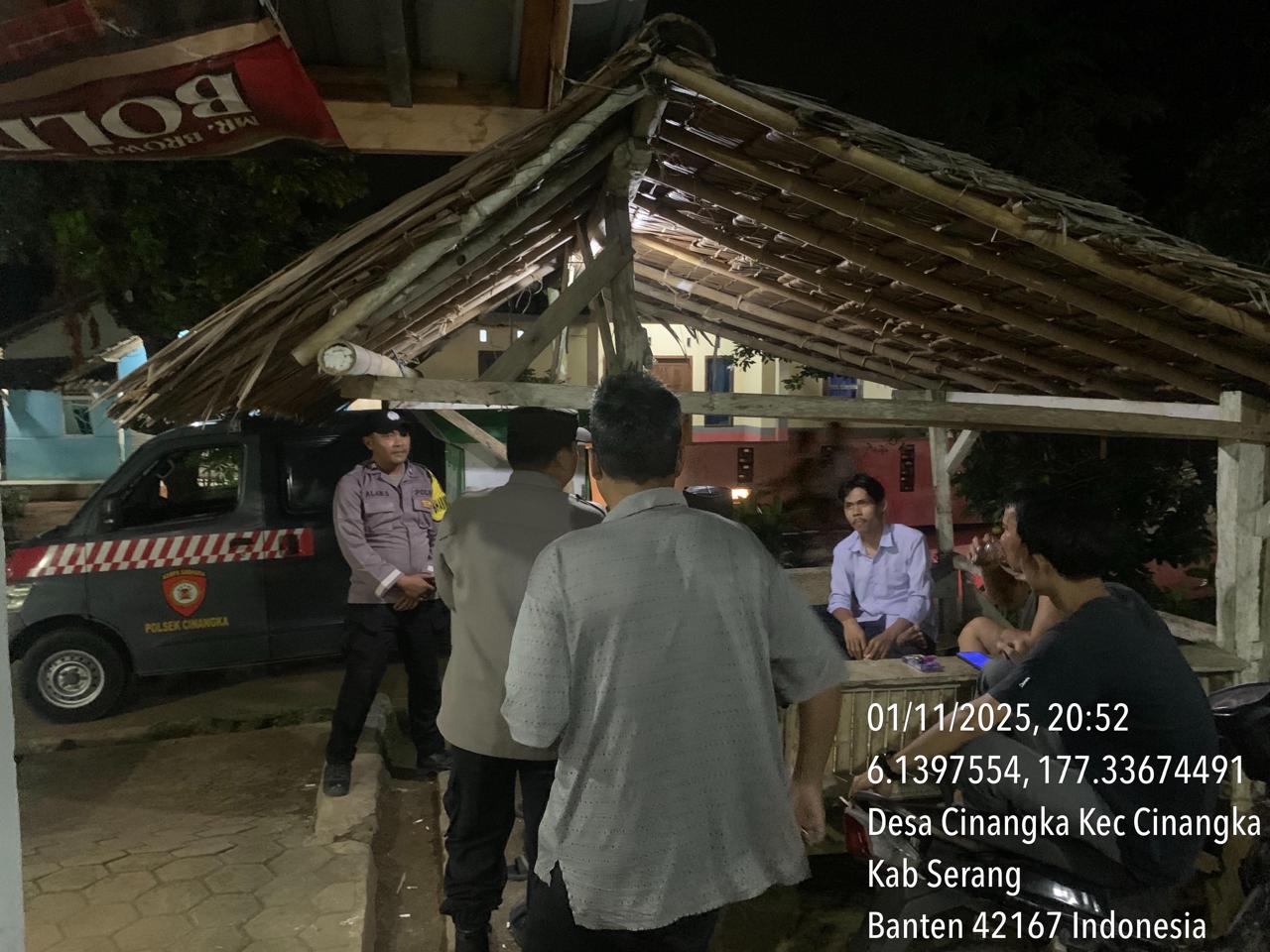 *Polres Cilegon* || Personel Bhabinkamtibmas Polsek Cinangka melaksanakan Program Komandan Wish Kapolda Banten RONDA SATKAMLING menyampaikan komunikasi dengan Petugas Siskamling agar berperan aktif dalam menciptakan Harkamtibmas yang aman dan Kondusif, Minggu (02/11/2025).