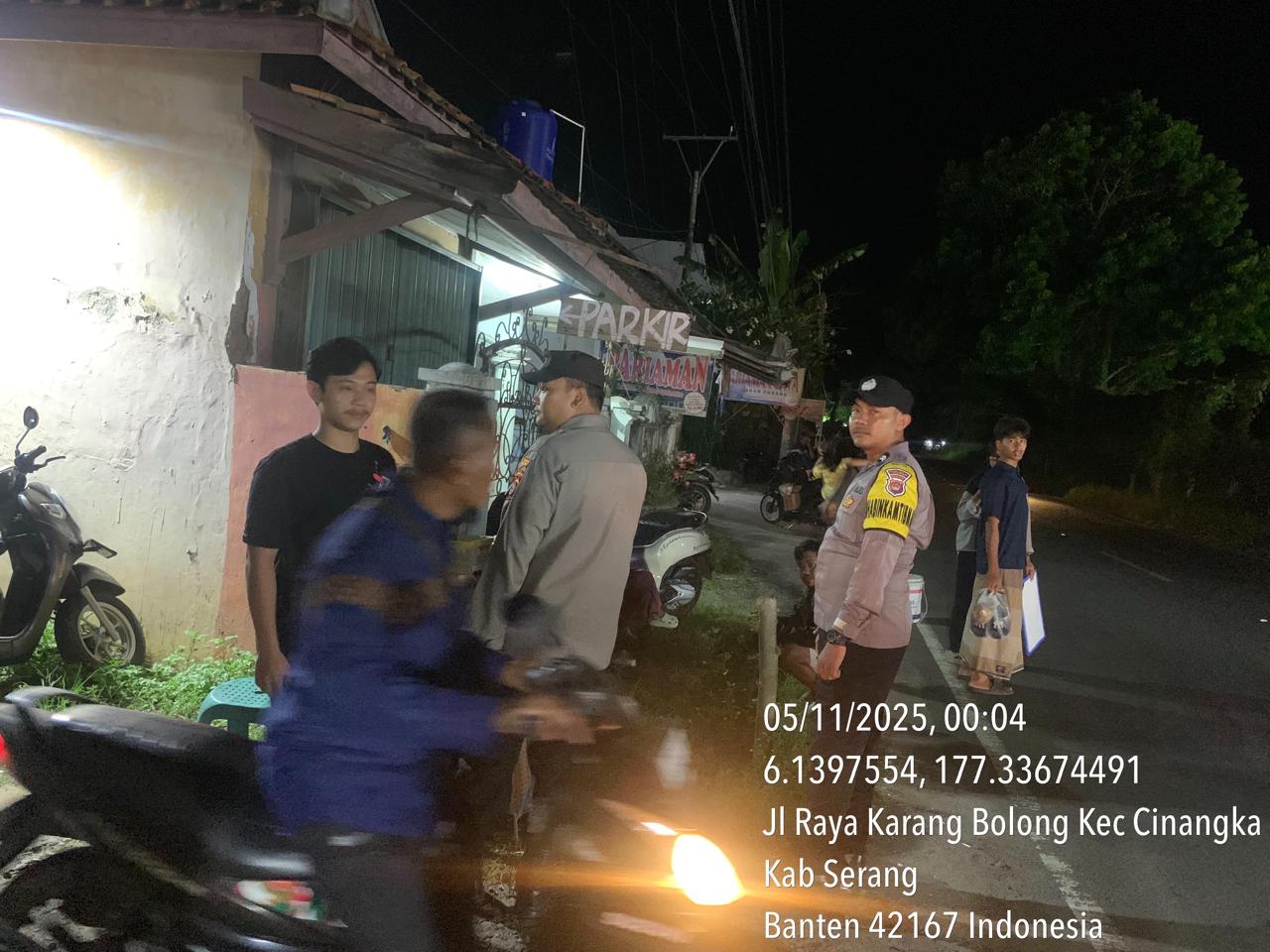 *Cilegon* – Dalam Rangka Pencegahan Kejahatan Jalanan dan Memelihara situasi keamanan dan menjaga serta memberikan rasa aman dan nyaman di masyarakat,Salah satu upaya untuk mewujudkan hal tersebut sebagaimana yang dilakukan oleh Personil Polsek Cinangka Polres Cilegon Polda Banten melaksanakan giat patroli blue light malam hari hingga menjelang pagi, Rabu (05/11/2025).