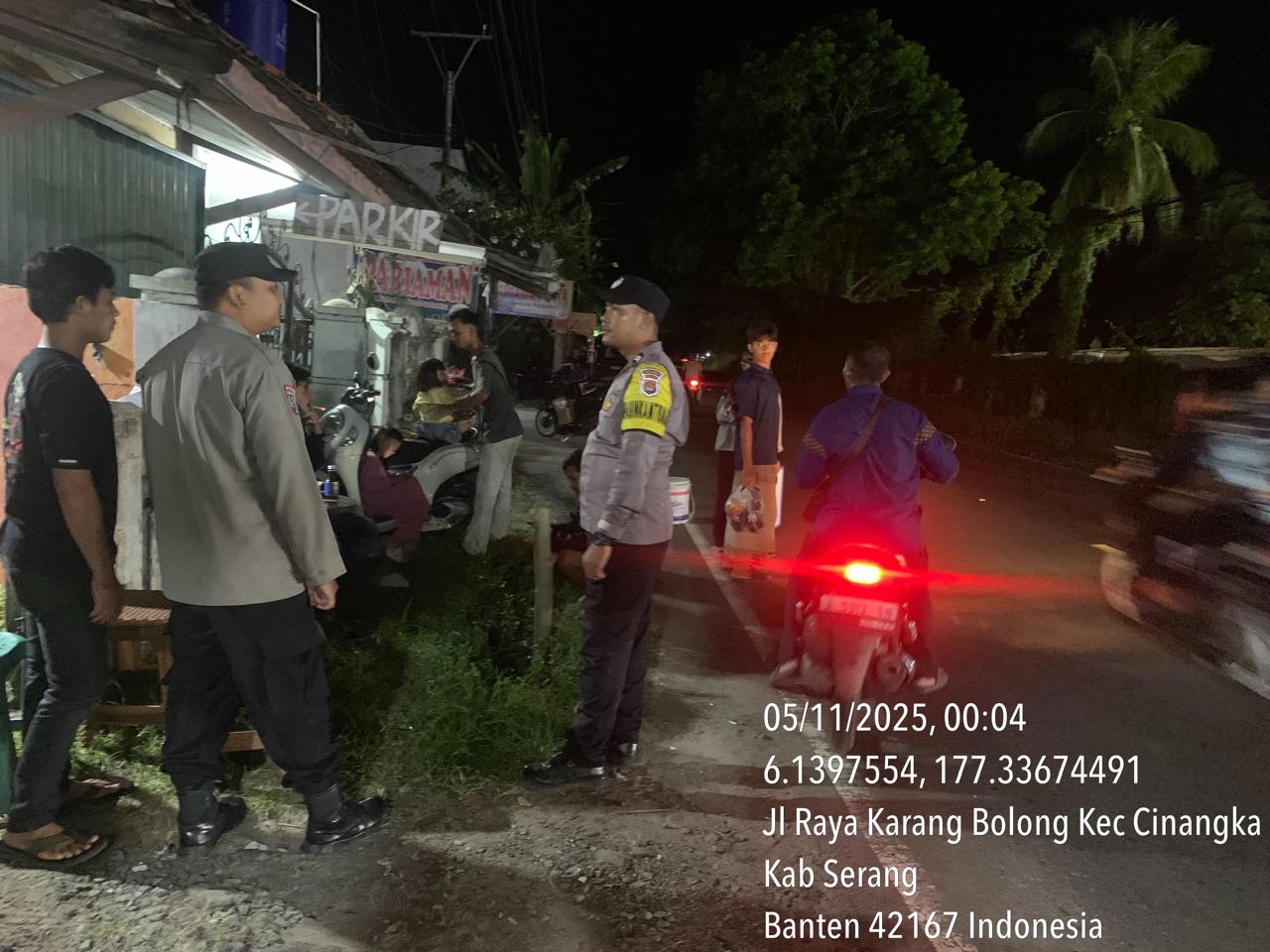 *Cilegon* – Dalam Rangka Pencegahan Kejahatan Jalanan dan Memelihara situasi keamanan dan menjaga serta memberikan rasa aman dan nyaman di masyarakat,Salah satu upaya untuk mewujudkan hal tersebut sebagaimana yang dilakukan oleh Personil Polsek Cinangka Polres Cilegon Polda Banten melaksanakan giat patroli blue light malam hari hingga menjelang pagi, Rabu (05/11/2025).