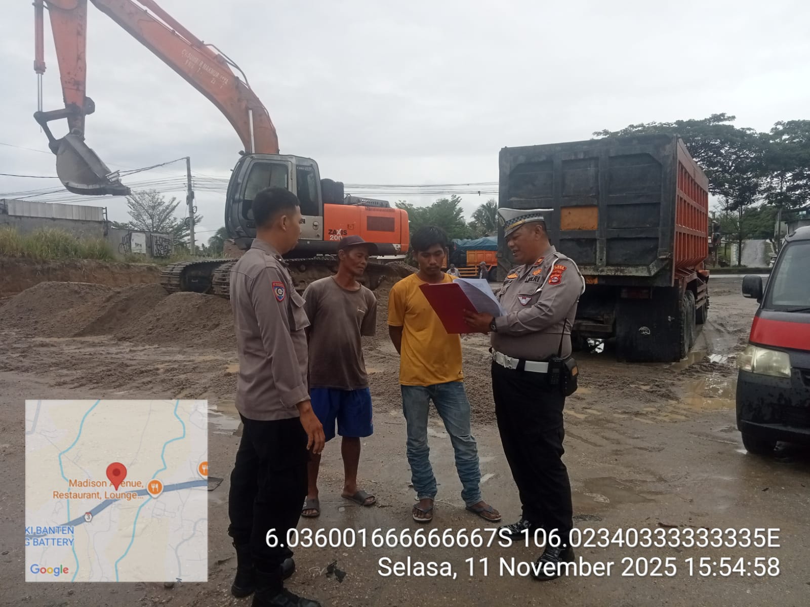Cilegon - Panit Lantas Polsek Ciwandan IPTU Deni Mulyana dan Bhabinkamtibmas Kelurahan Tamanbaru AIPDA Ediyanto melaksanakan monitoring stokfile pasir di Lingkungan Kubang Lesung Pabuaran PT. Pamungkas Perkasa, Kelurahan Tamanbaru, Kecamatan Citangkil, Kota Cilegon, Selasa (11/11/2025).