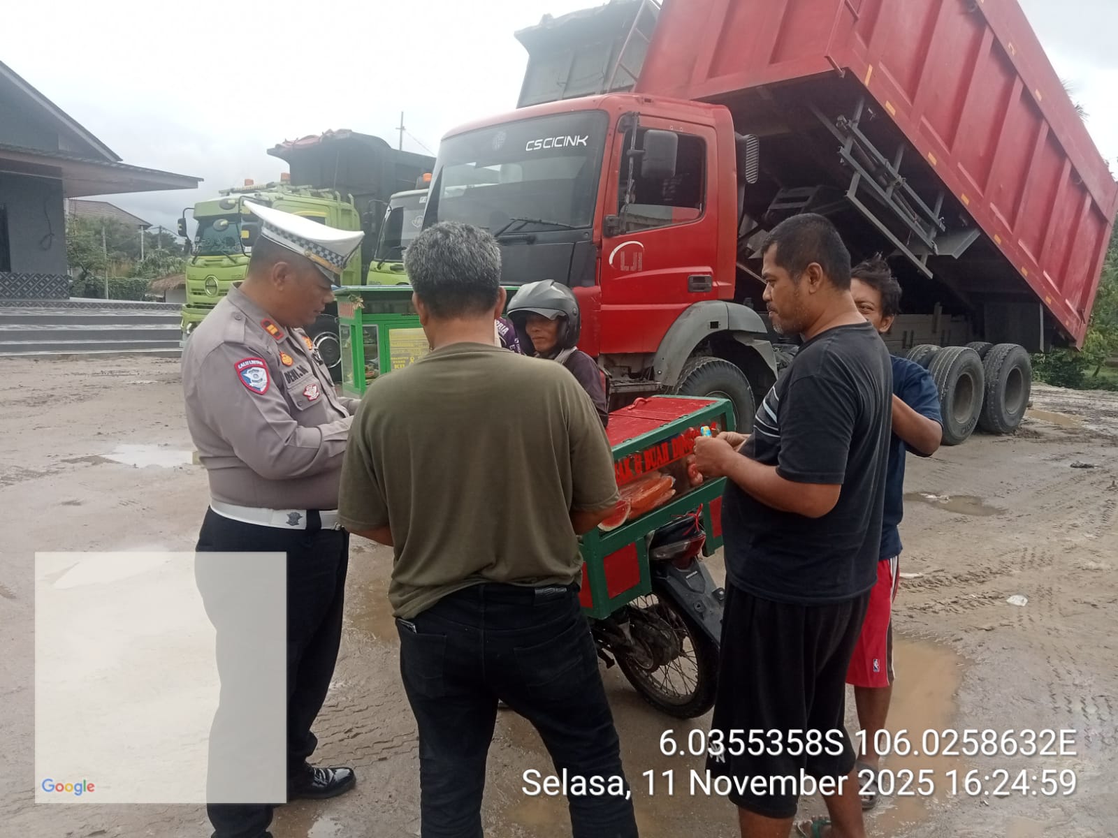 Cilegon - Panit Lantas Polsek Ciwandan IPTU Deni Mulyana dan Bhabinkamtibmas Kelurahan Tamanbaru AIPDA Ediyanto melaksanakan monitoring stokfile pasir di Lingkungan Kubang Lesung Pabuaran PT. Pamungkas Perkasa, Kelurahan Tamanbaru, Kecamatan Citangkil, Kota Cilegon, Selasa (11/11/2025).