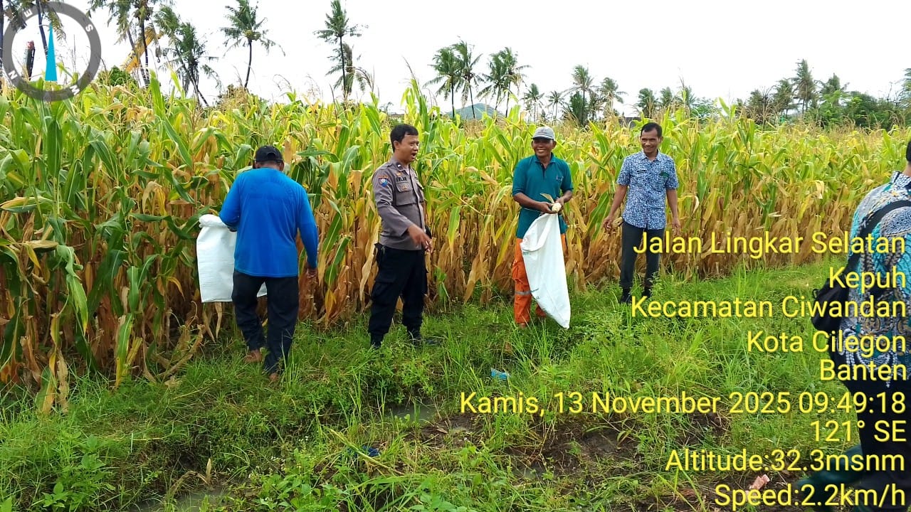 Cilegon - Polsek Ciwandan Polres Cilegon Polda Banten mendukung kegiatan panen jagung Hibrida hasil penanaman Poktan Blumbang Tani di Kelurahan Tegal Ratu, Kecamatan Ciwandan, Kota Cilegon, Kamis (13/11/2025)