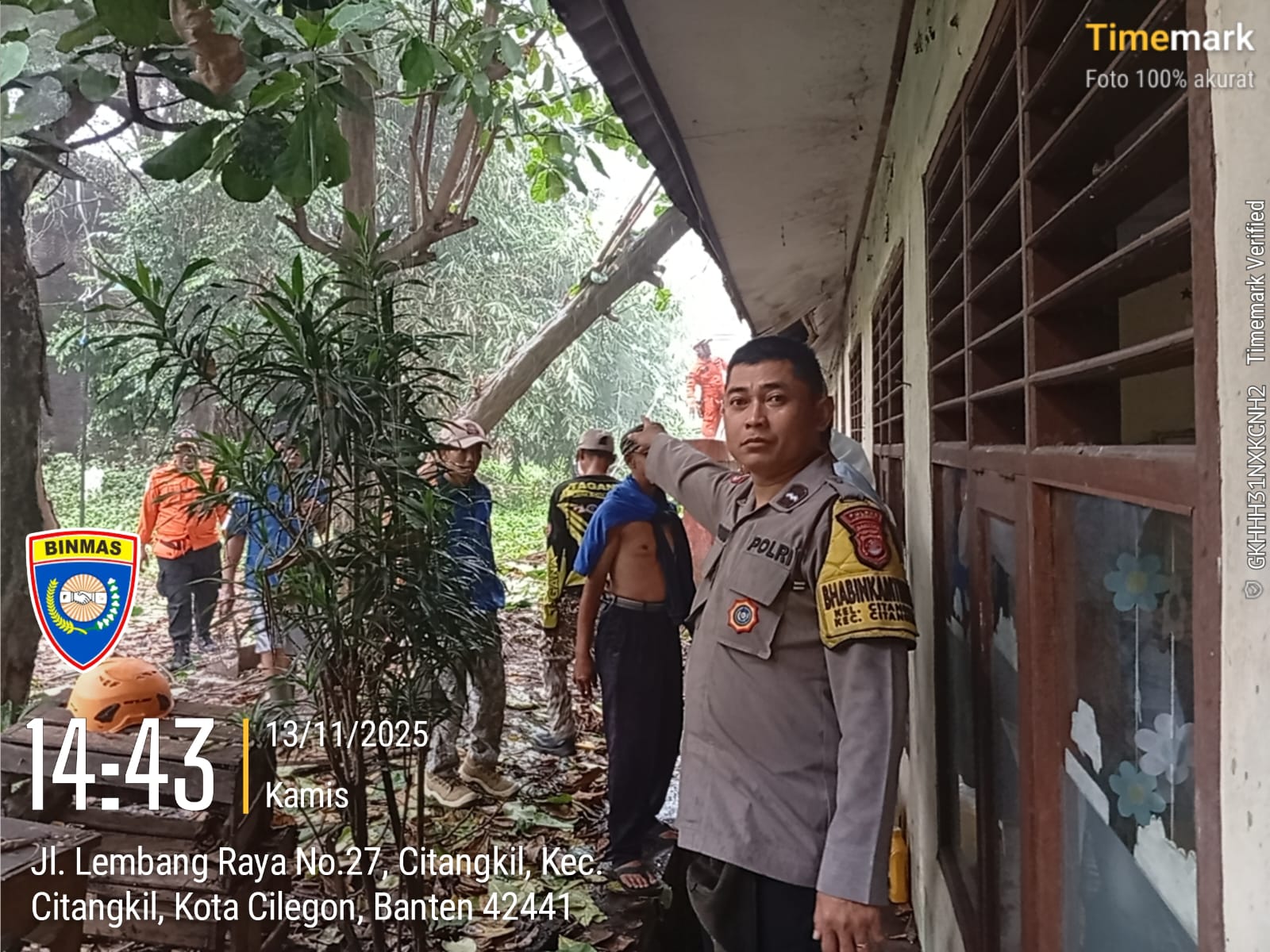 Cilegon -  Pohon ketapang tumbang dan menimpa gedung SDN Tegal Cabe, Lingkungan Tegal Cabe RT 04/02, Kelurahan Citangkil, Kecamatan Citangkil, Kota Cilegon, Kamis (13/11/2025).