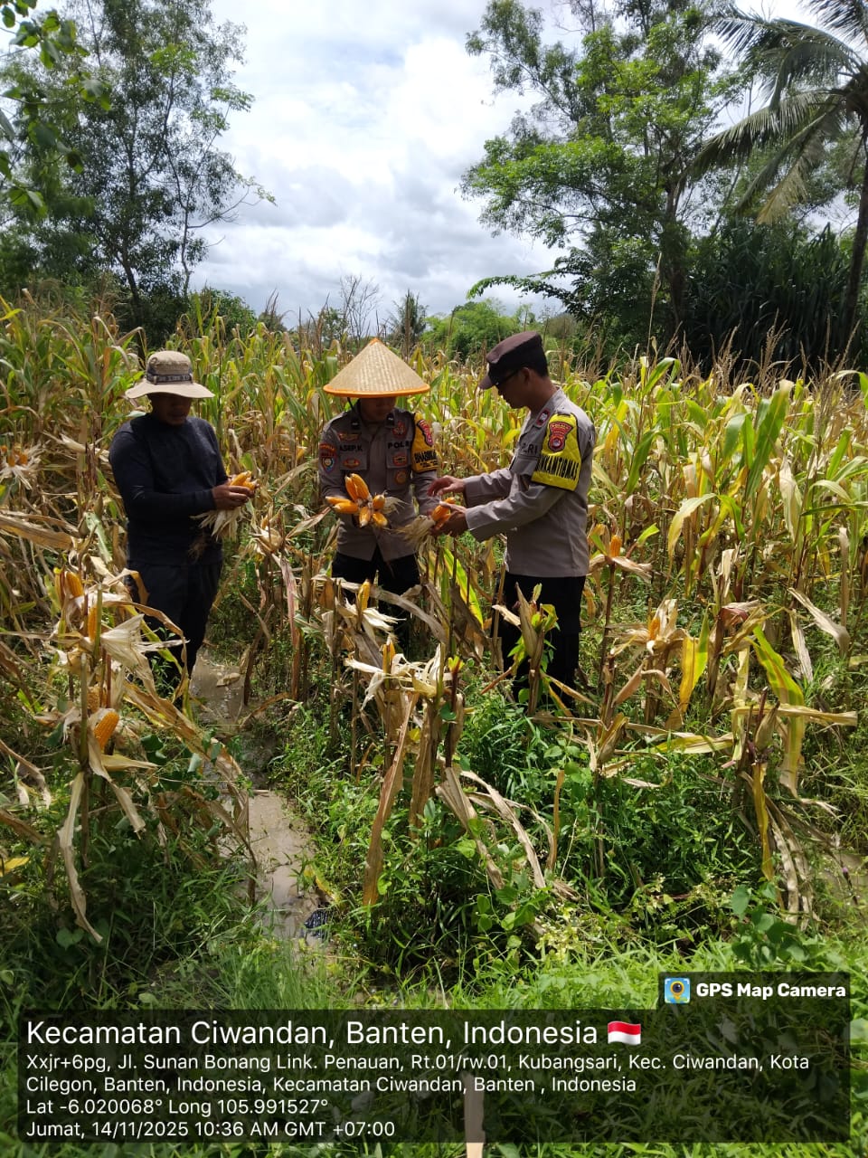 Cilegon - Polsek Ciwandan Polres Cilegon Polda Banten mendukung kegiatan panen jagung Hibrida hasil penanaman Kelompok Tani Kubang Lestari I di Kelurahan Kubangsari Kecamatan Ciwandan, Kota Cilegon, Jum’at (14/11/2025).
