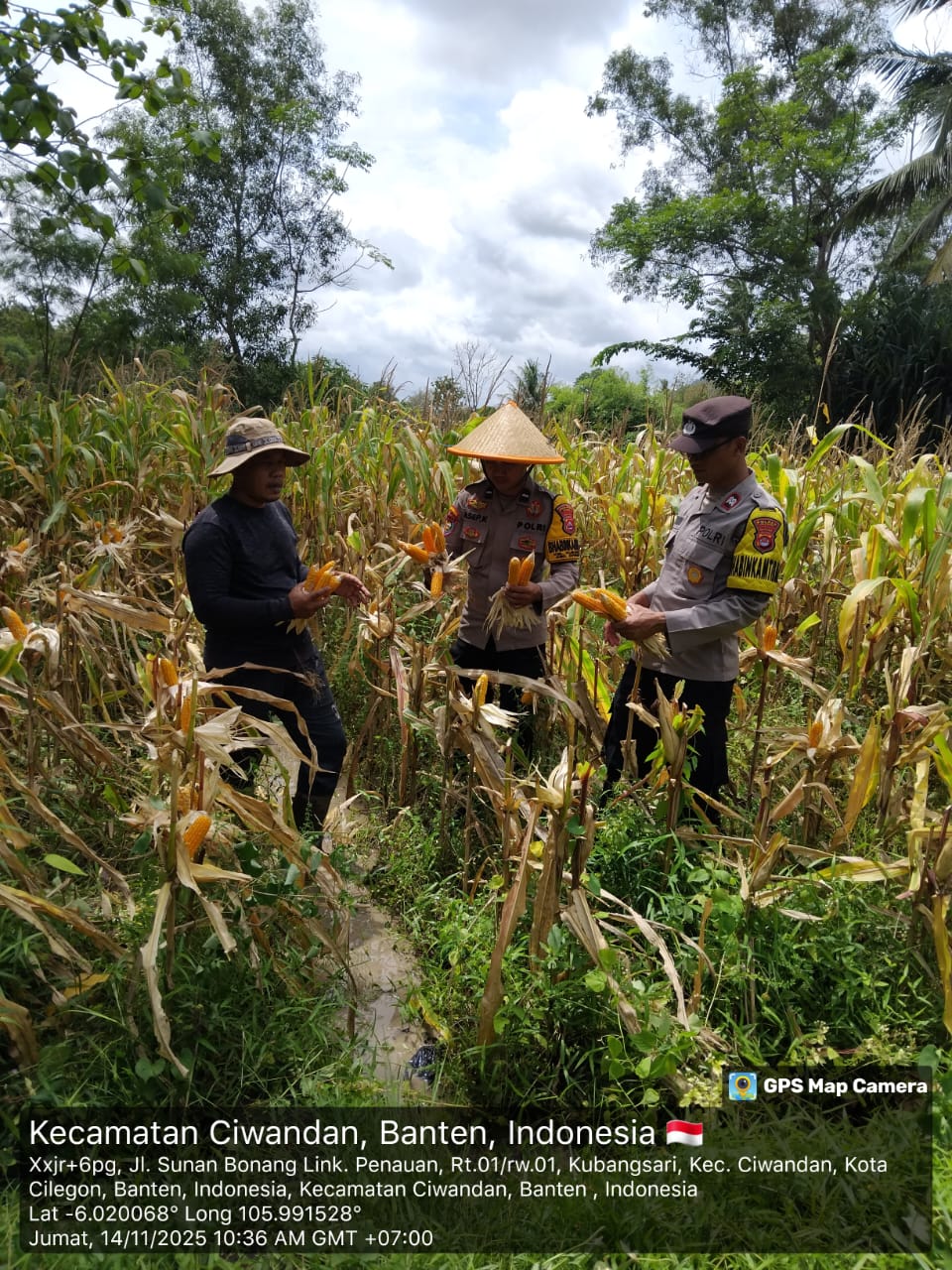 Cilegon - Polsek Ciwandan Polres Cilegon Polda Banten mendukung kegiatan panen jagung Hibrida hasil penanaman Kelompok Tani Kubang Lestari I di Kelurahan Kubangsari Kecamatan Ciwandan, Kota Cilegon, Jum’at (14/11/2025).