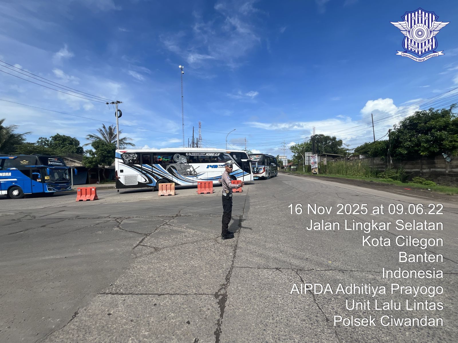Cilegon - Personil Unit Lantas Polsek Ciwandan Polres Cilegon Polda Banten melaksanakan kegiatan monitoring jalur wisata di depan Pos Lantas JLS Ciwandan, Minggu, (16/11/2025).
