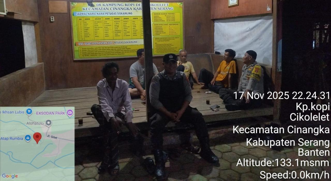 *Polres Cilegon* || Personel Bhabinkamtibmas Polsek Cinangka melaksanakan Program Komandan Wish Kapolda Banten RONDA SATKAMLING menyampaikan komunikasi dengan Petugas Siskamling agar berperan aktif dalam menciptakan Harkamtibmas yang aman dan Kondusif, Selasa (18/11/2025).