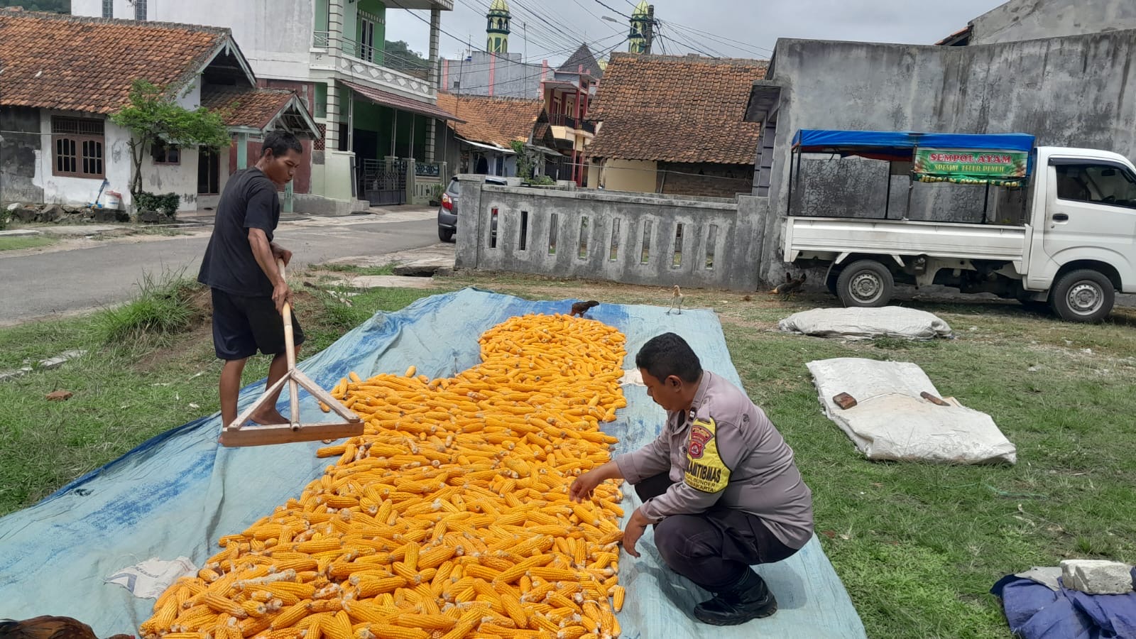 Bhabinkamtibmas di Kelurahan Tegalbunder polsek Purwakarta Polres Cilegon Dampingi Petani Jemur Jagung, Wujud Kedekatan Polri dengan Masyarakat