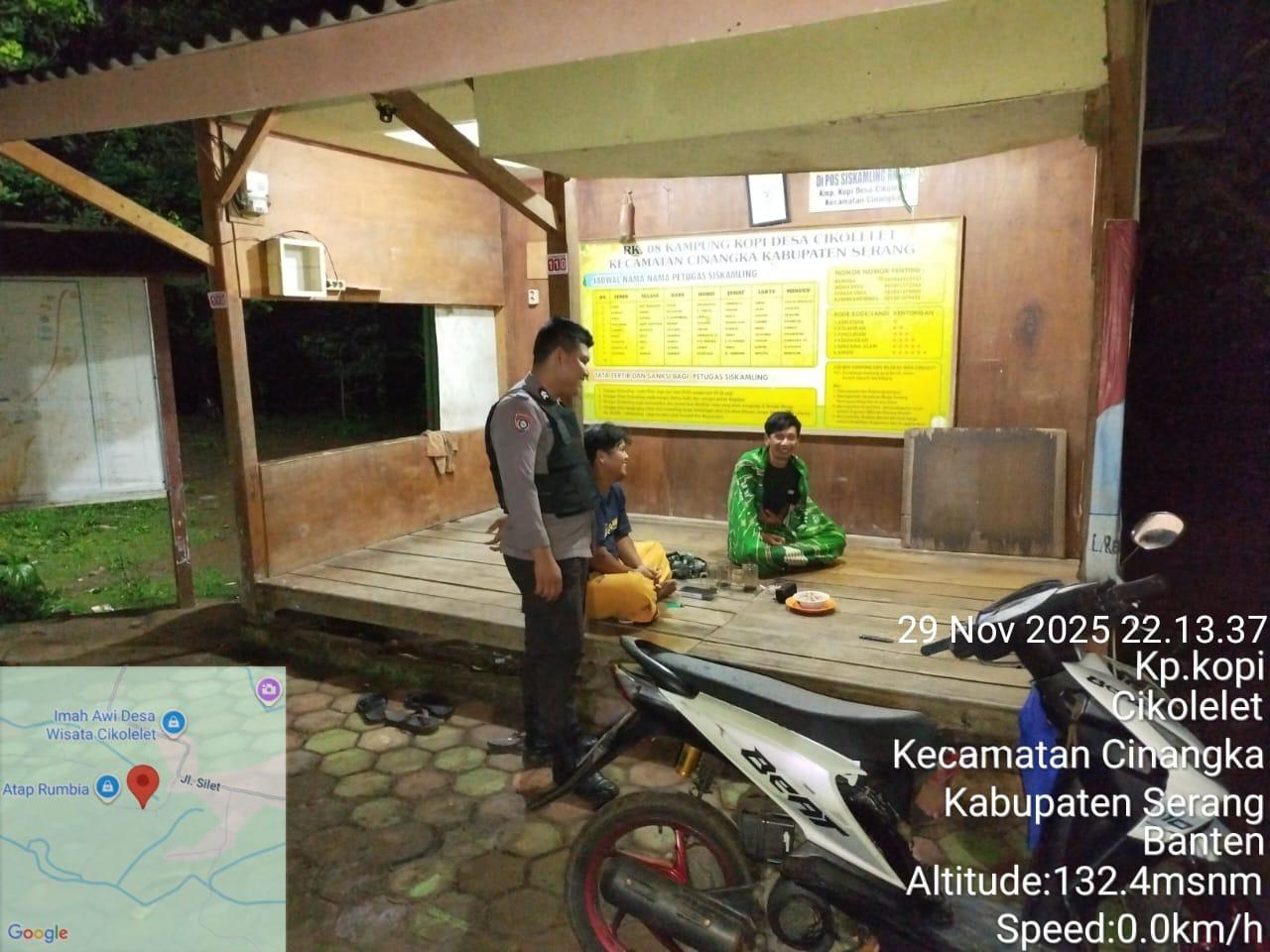 *Polres Cilegon* || Personil Bhabinkamtibmas Polsek Cinangka melaksanakan Program Komandan Wish Kapolda Banten RONDA SATKAMLING menyampaikan komunikasi dengan Petugas Siskamling agar berperan aktif dalam menciptakan Harkamtibmas yang aman dan Kondusif, Minggu (30/11/2025).