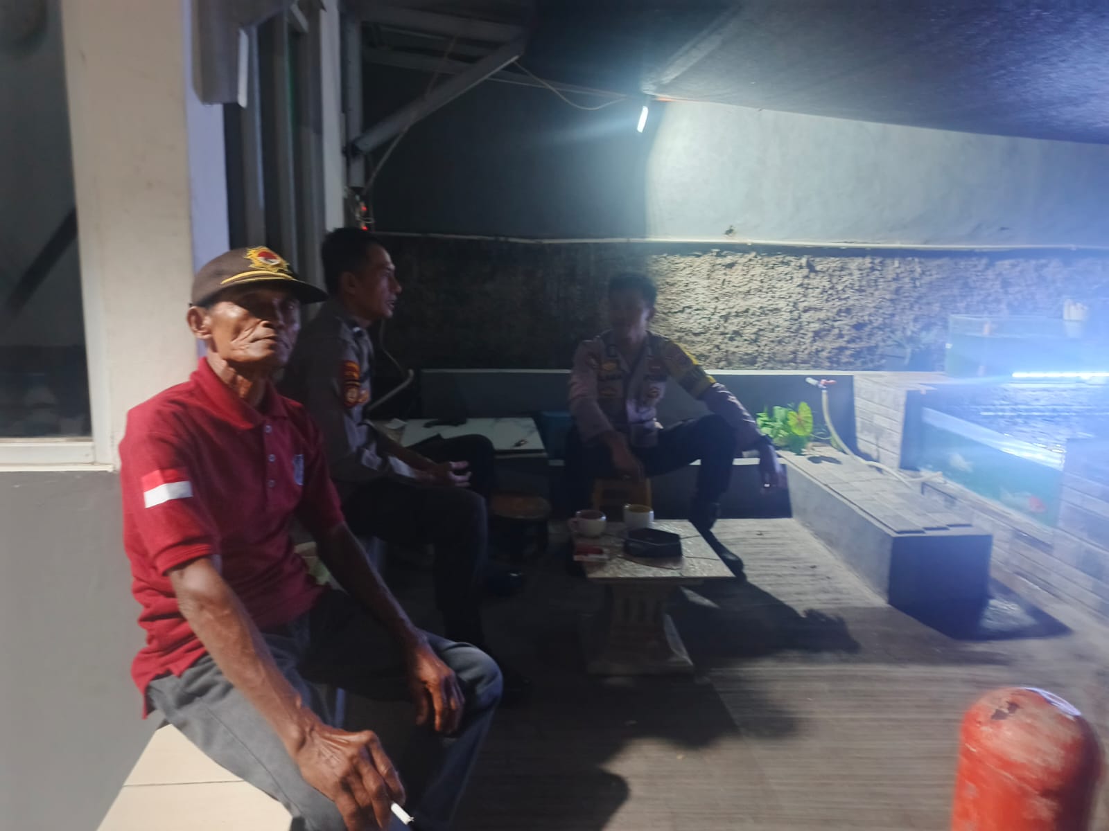 Anggota unit  patroli samapra Polsek Cilegon sambangi ronda malam sampaikan pesan kamtibmas jaga keamanan di lingkungan