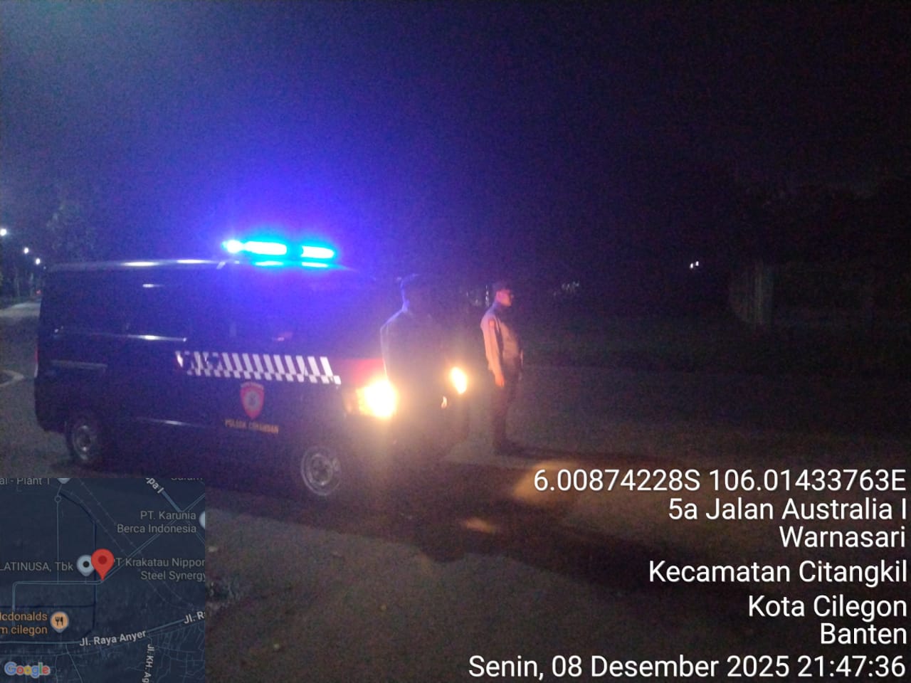 Cilegon - Personil Polsek Ciwandan Polres Cilegon Polda Banten Dalam Pelaksanaan Kegiatan Patroli dengan menyalakan lampu rotator berwarna biru di Daerah Hukum Polsek Ciwandan Polres Cilegon Polda Banten dari malam hingga dini hari, dalam rangka menciptakan situasi aman dan kondusif, Senin (08/12/2025).