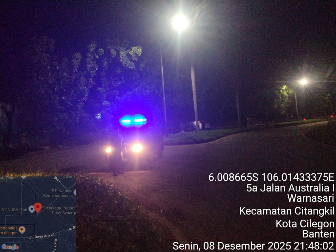 Cilegon - Personil Polsek Ciwandan Polres Cilegon Polda Banten Dalam Pelaksanaan Kegiatan Patroli dengan menyalakan lampu rotator berwarna biru di Daerah Hukum Polsek Ciwandan Polres Cilegon Polda Banten dari malam hingga dini hari, dalam rangka menciptakan situasi aman dan kondusif, Senin (08/12/2025).