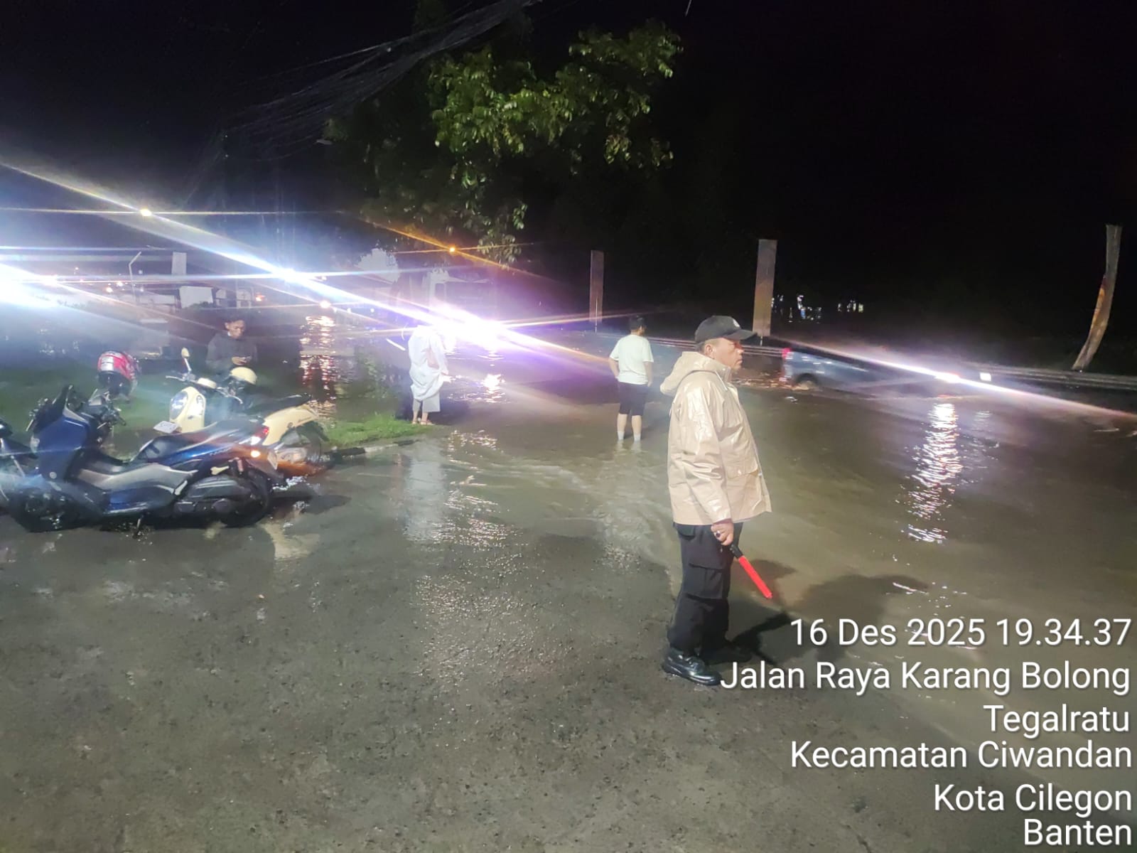 Cilegon - Personil Polsek Ciwandan melaksanakan monitoring genangan air dampak cuaca hujan lebat di wilayah hukum Polsek Ciwandan, Selasa (16/12/2025).
