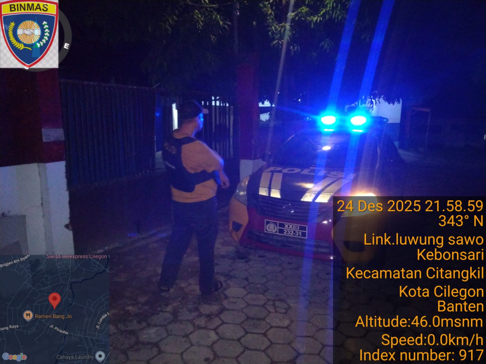 Cilegon - Personil Polsek Ciwandan Polres Cilegon Polda Banten Dalam Pelaksanaan Kegiatan Patroli dengan menyalakan lampu rotator berwarna biru di Daerah Hukum Polsek Ciwandan Polres Cilegon Polda Banten dari malam hingga dini hari, dalam rangka menciptakan situasi aman dan kondusif, Kamis (25/12/2025).