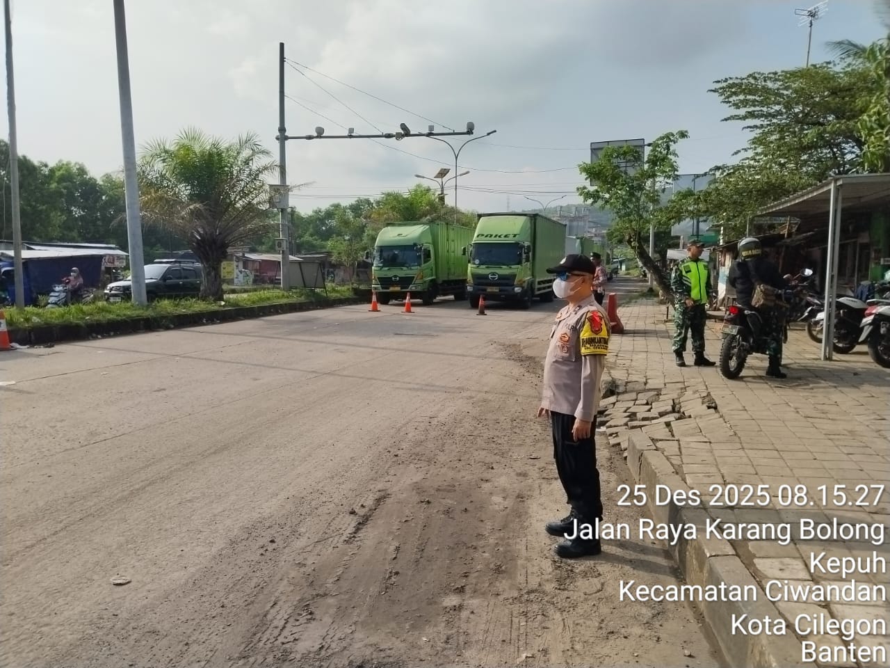 Cilegon - Guna Menciptakan kelancaran arus Mudik Natal tahun 2025 Dan Tahun Baru 2026 yang menuju Pelabuhan Pelindo Dan jalur wisata yang ada di daerah hukum Polsek Ciwandan Polres Cilegon Polda Banten,Pospam 5 Ciwandan berlakukan rekayasa Lalu lintas, Kamis (25/12/2025).
