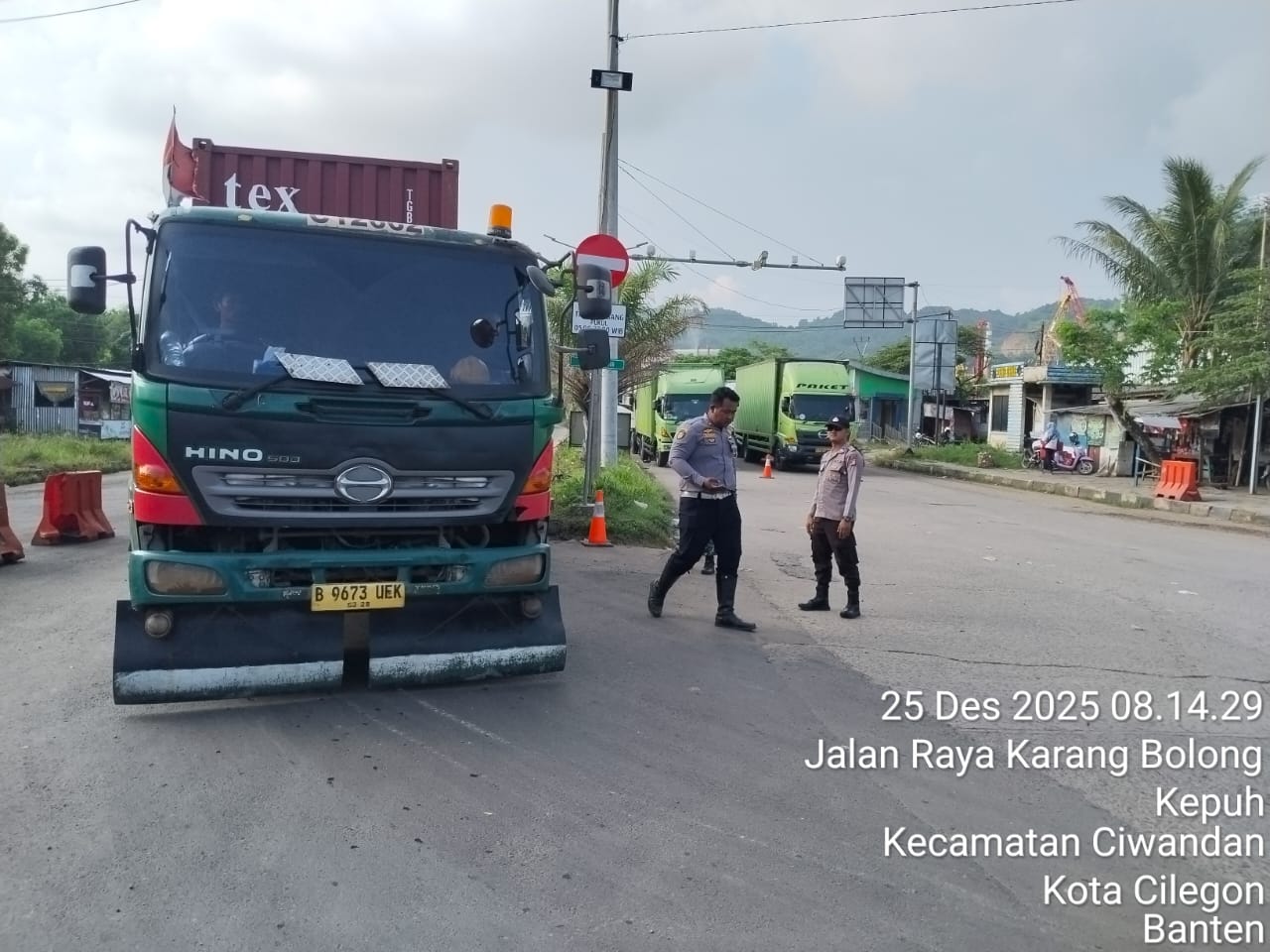 Cilegon - Guna Menciptakan kelancaran arus Mudik Natal tahun 2025 Dan Tahun Baru 2026 yang menuju Pelabuhan Pelindo Dan jalur wisata yang ada di daerah hukum Polsek Ciwandan Polres Cilegon Polda Banten,Pospam 5 Ciwandan berlakukan rekayasa Lalu lintas, Kamis (25/12/2025).