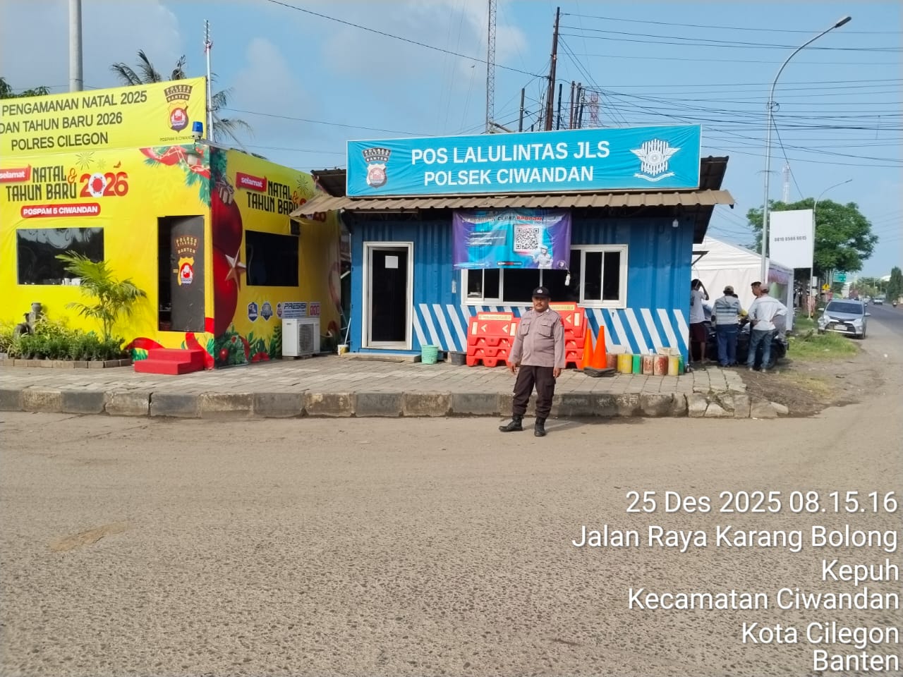 Cilegon - Guna Menciptakan kelancaran arus Mudik Natal tahun 2025 Dan Tahun Baru 2026 yang menuju Pelabuhan Pelindo Dan jalur wisata yang ada di daerah hukum Polsek Ciwandan Polres Cilegon Polda Banten,Pospam 5 Ciwandan berlakukan rekayasa Lalu lintas, Kamis (25/12/2025).