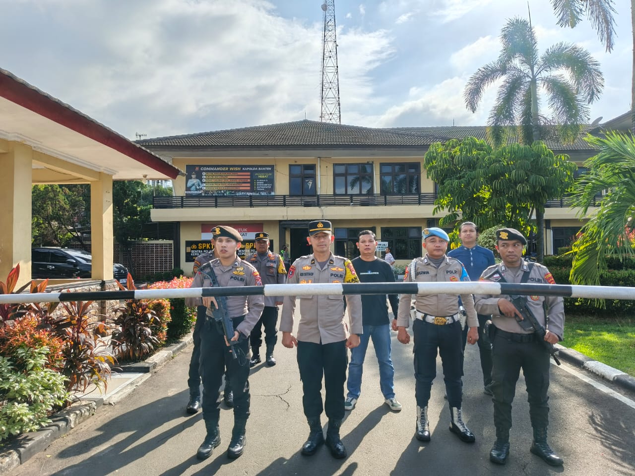 Cilegon, personel Satreskrim Polres Cilegon Polda Banten melaksanakan piket di penjagaan pintu masuk Polres Cilegon Polda Banten untuk memastikan mako Polres Cilegon dalam keadaan aman dan nyaman dalam melayani Masyarakat. sabtu (27/12/2025).
