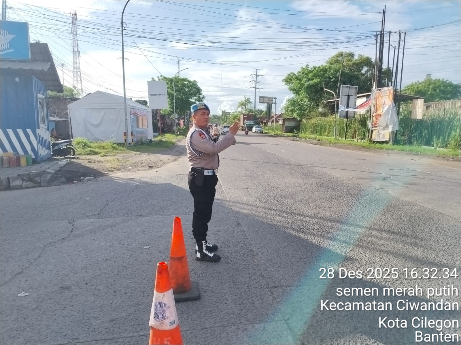 Cilegon - Guna Menciptakan kelancaran arus Lalu-Lintas Perayaan Natal Dan Tahun Baru menuju jalur wisata Anyer-Cinagka yang ada di daerah hukum Polsek Ciwandan Polres Cilegon Polda Banten,Pospam 5 Ciwandan berlakukan rekayasa Lalu lintas, Minggu (28/12/2025).