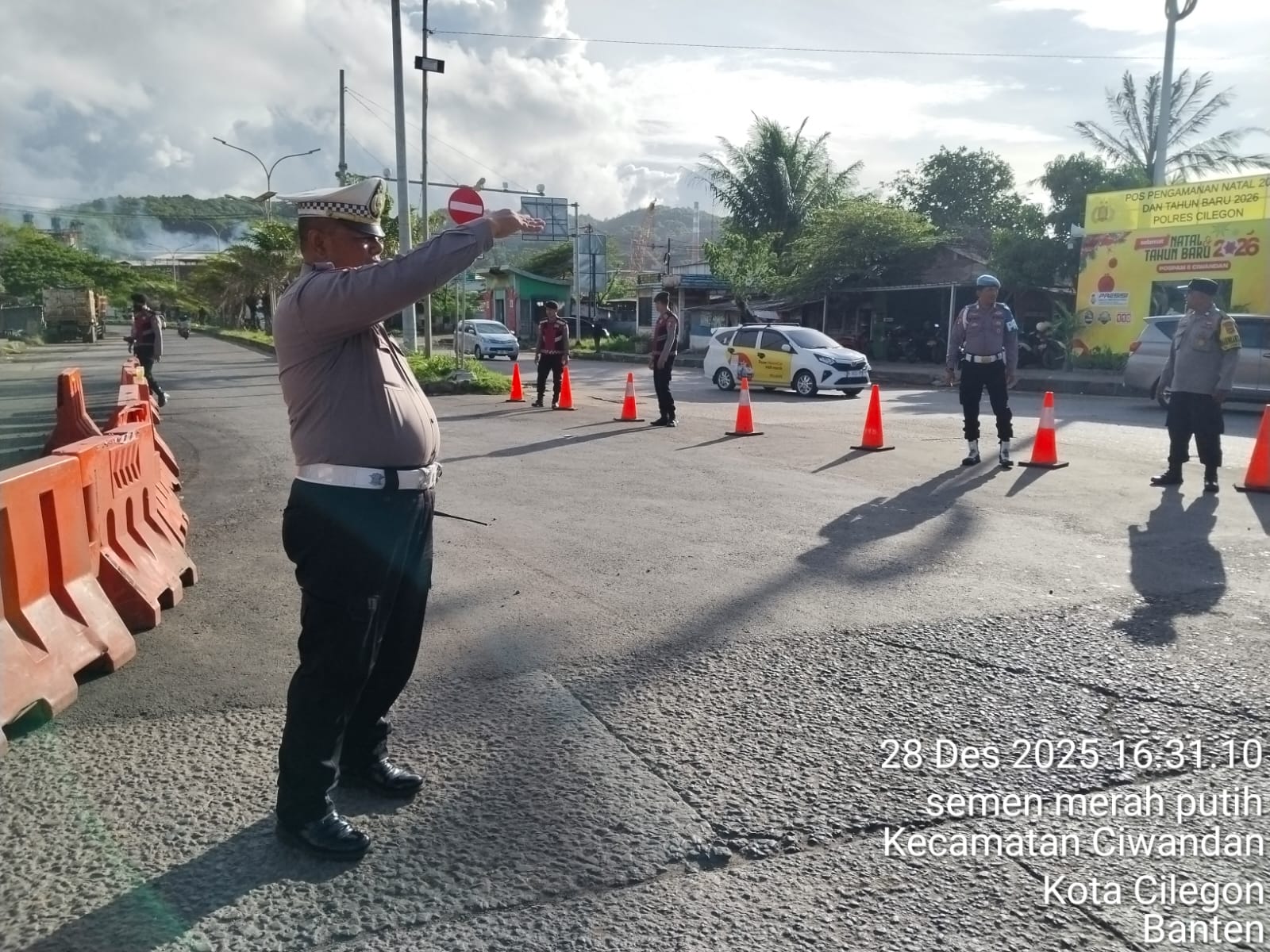 Cilegon - Guna Menciptakan kelancaran arus Lalu-Lintas Perayaan Natal Dan Tahun Baru menuju jalur wisata Anyer-Cinagka yang ada di daerah hukum Polsek Ciwandan Polres Cilegon Polda Banten,Pospam 5 Ciwandan berlakukan rekayasa Lalu lintas, Minggu (28/12/2025).