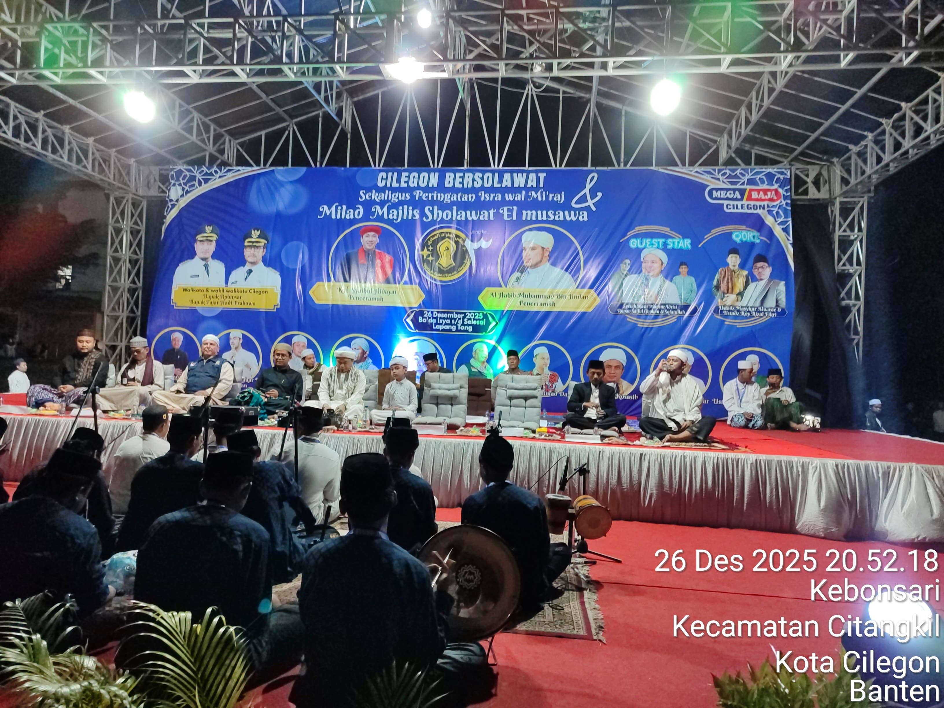 Cilegon - Polres Cilegon melalui Polsek Ciwandan melaksanakan monitoring kegiatan Gema Cilegon Bersholawat dalam rangka Majlis Sholawat El-Musawa ke-3 dan peringatan Isro Mi'raj Nabi Muhammad SAW di Lapangan Tong Alamat, Kebon Sari, Citangkil, Minggu (28/12/2025).
