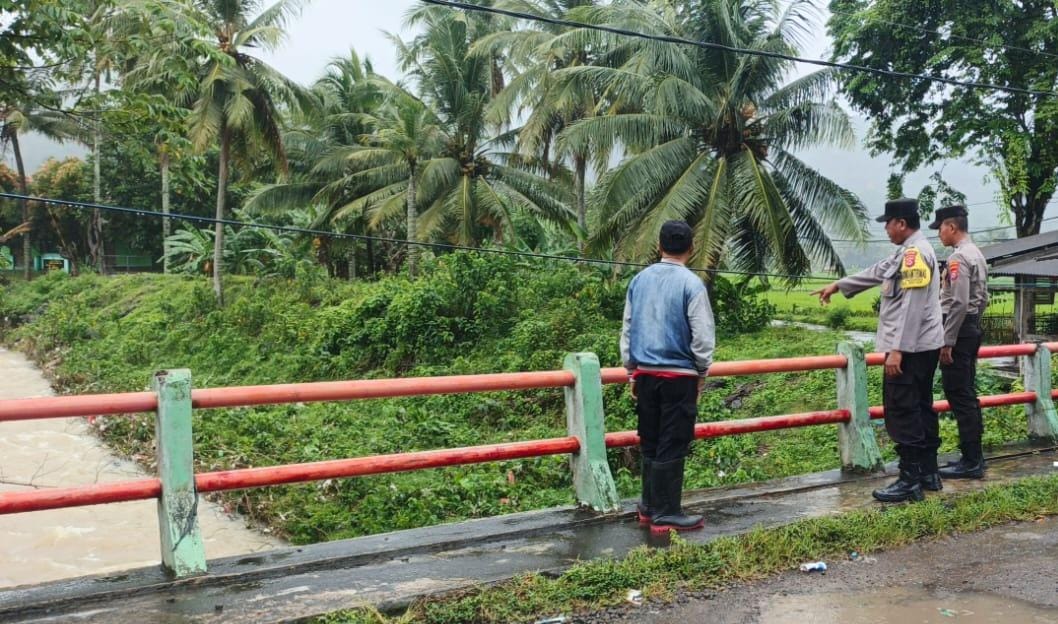 Personel Polsek Anyar Polres Cilegon Polda Banten melaksanakan Patroli kewilayahan mengecek debit air di Sungai pasca Hujan antisipasi banjir di wilayah Kec. Anyar, Senin (29/12).