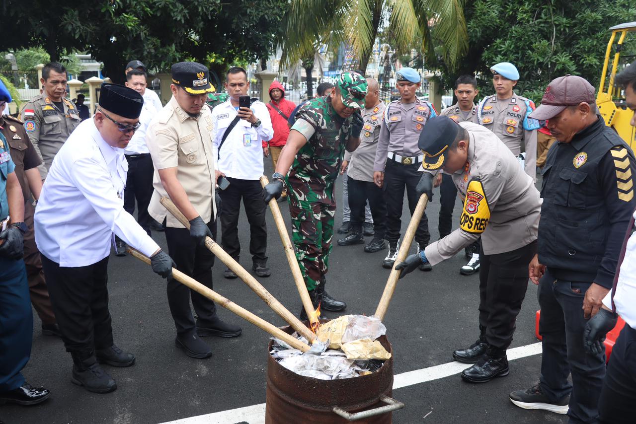 Kegiatan dilanjutkan pembacaan doa, foto bersama, serta pemusnahan barang bukti secara simbolis dan transparan disaksikan seluruh pihak terkait. Proses pemusnahan dilakukan secara aman dan ramah lingkungan dengan penandatanganan Berita Acara di akhir kegiatan sebagai bentuk pertanggungjawaban.