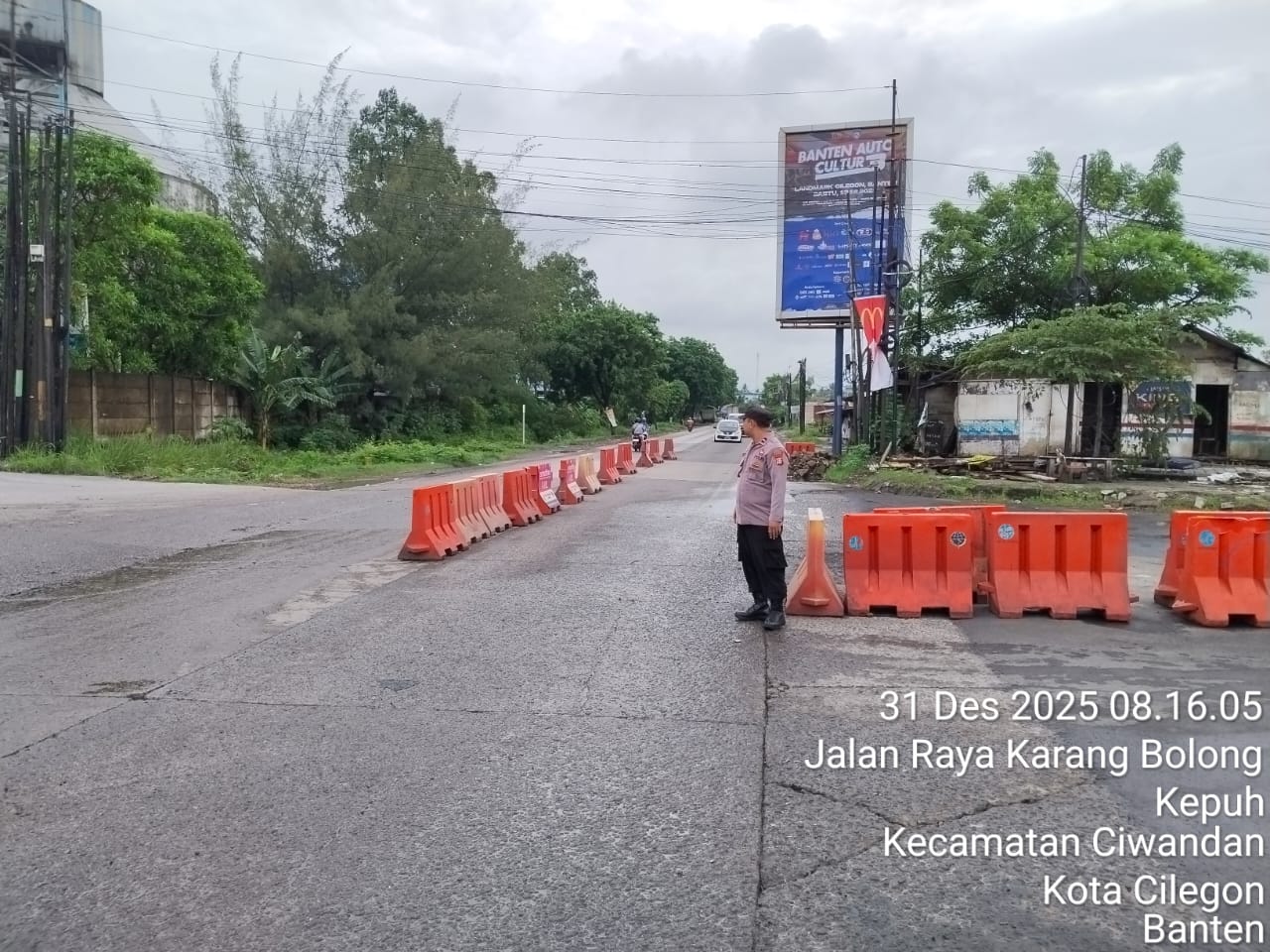 Cilegon - Guna Menciptakan kelancaran arus Mudik Natal tahun 2025 Dan Tahun Baru 2026 yang menuju Pelabuhan Pelindo Dan jalur wisata yang ada di daerah hukum Polsek Ciwandan Polres Cilegon Polda Banten,Pospam 5 Ciwandan berlakukan rekayasa Lalu lintas, Rabu (31/12/2025).