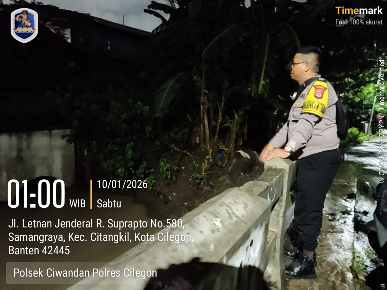 Cilegon - Personil Polsek Ciwandan Polres Cilegon Polda Banten, melaksanakan patroli antisipasi cuaca ekstrem di daerah hukumnya pada, Sabtu (10/01/2026).