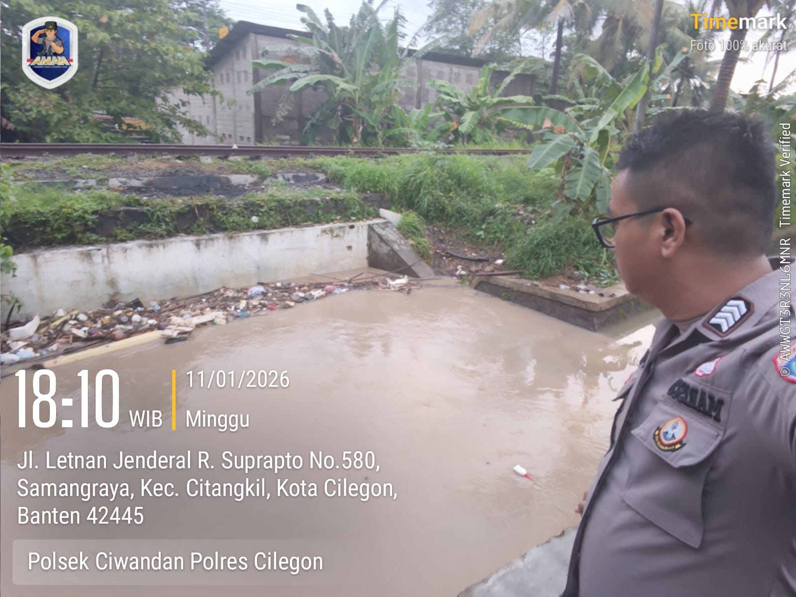 Cilegon - Dalam rangka antisipasi bencana alam personil Polsek ciwandan mengecek debit air di beberapa titik aliran sungai salah satunya yaitu kalimuk RT 005 RW 006 Kelurahan samang Raya Kecamatan citangkil Kota Cilegon, Minggu (11/01/2026).