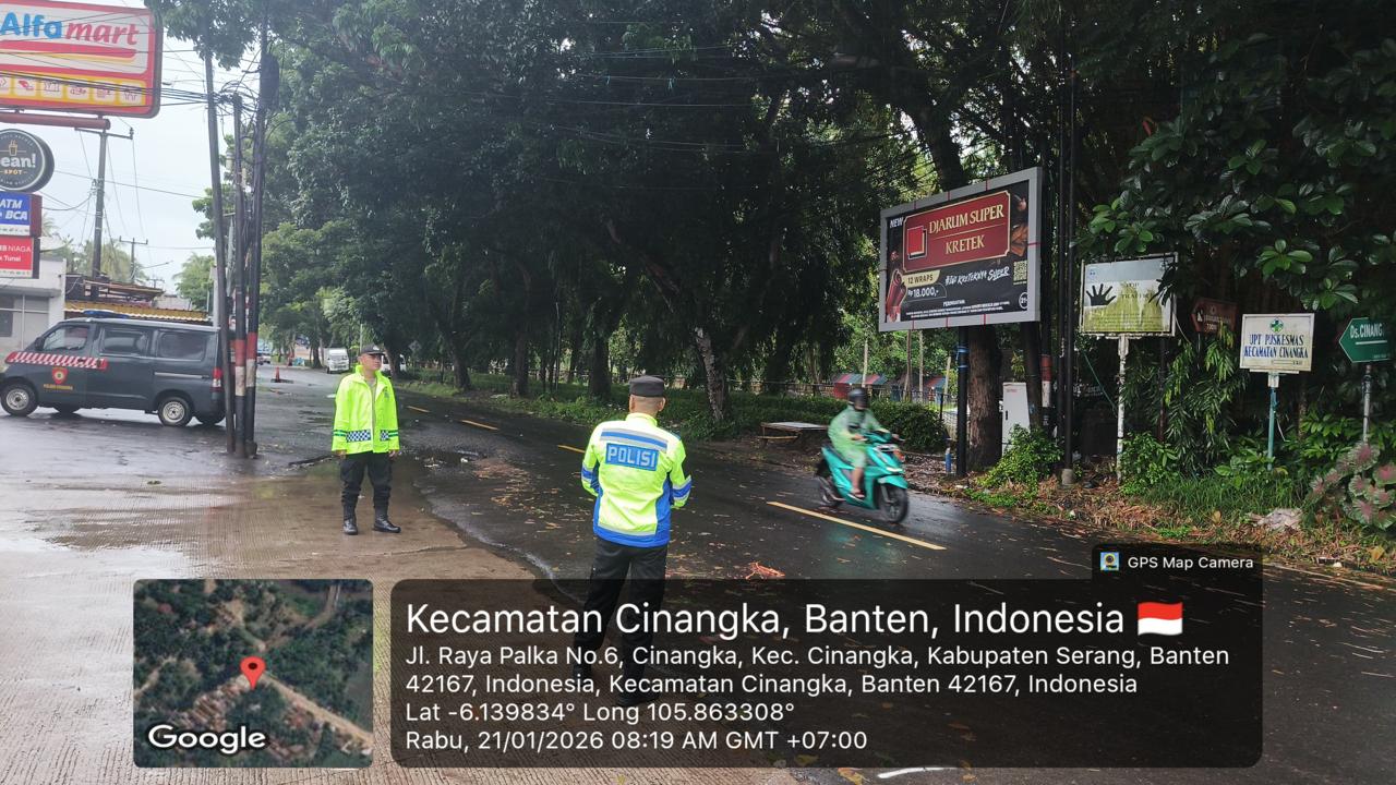 *Polres Cilegon* - Dalam Mewujudkan Aksi Nyata Pelayanan Kepada Masyarakat,Personil Polsek Cinangka Polres Cilegon Polda Banten Laksanakan Strong Poin Pengaturan Lalu-lintas, Kamis  (22/01/2026).