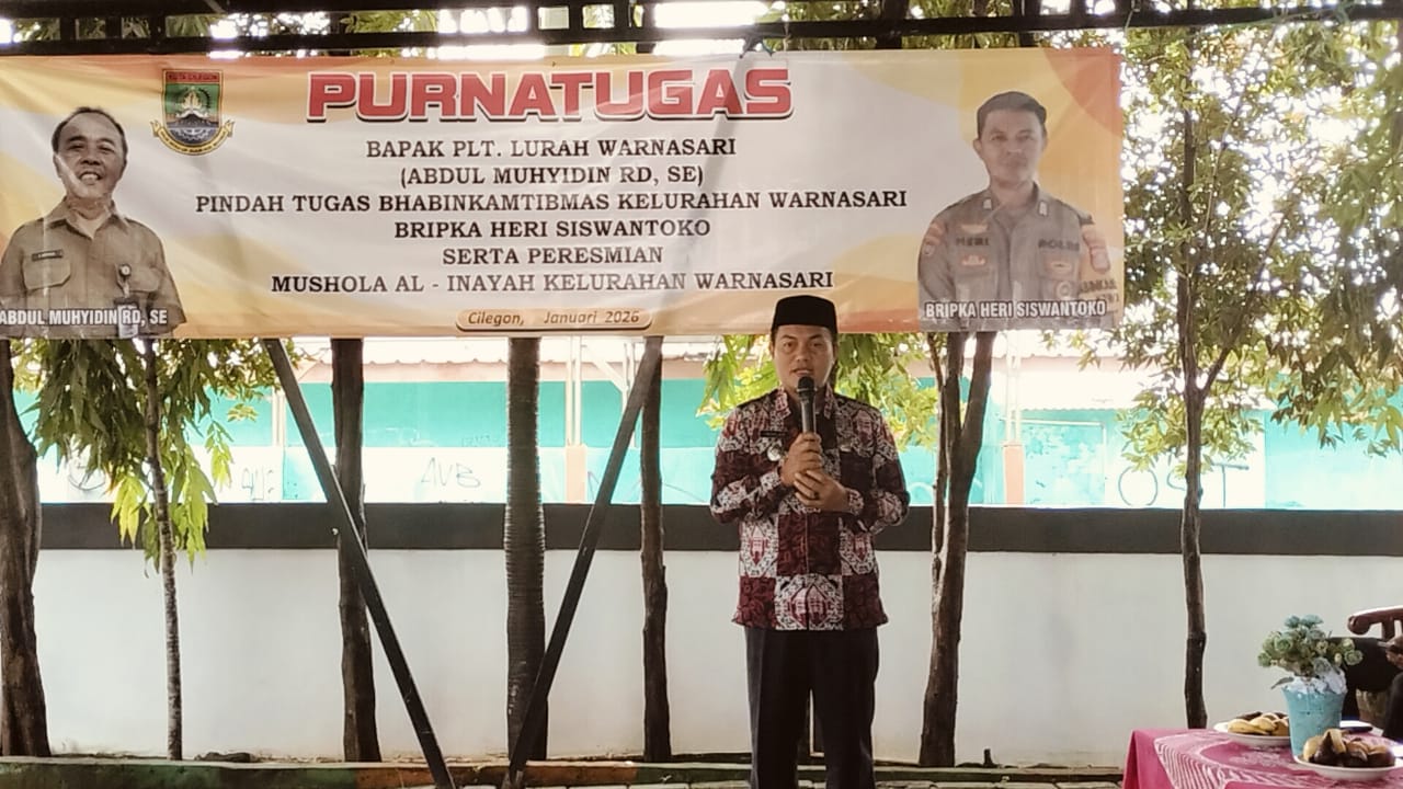 Cilegon - Bhabinkamtibmas Kelurahan Warnasari, AIPDA Mere Erlansyah, dan Bhabinkamtibmas Kelurahan Kepuh, BRIPKA Heri Siswantoko menghadiri kegiatan purna tugas PLT Lurah Warnasari dan pindah tugas Bhabinkamtibmas Kelurahan Warnasari, serta peresmian Mushola Al-Inayah Kelurahan Warnasari, di Kantor Kelurahan Warnasari, Citangkil, Cilegon. Jum'at (30/01/2026).