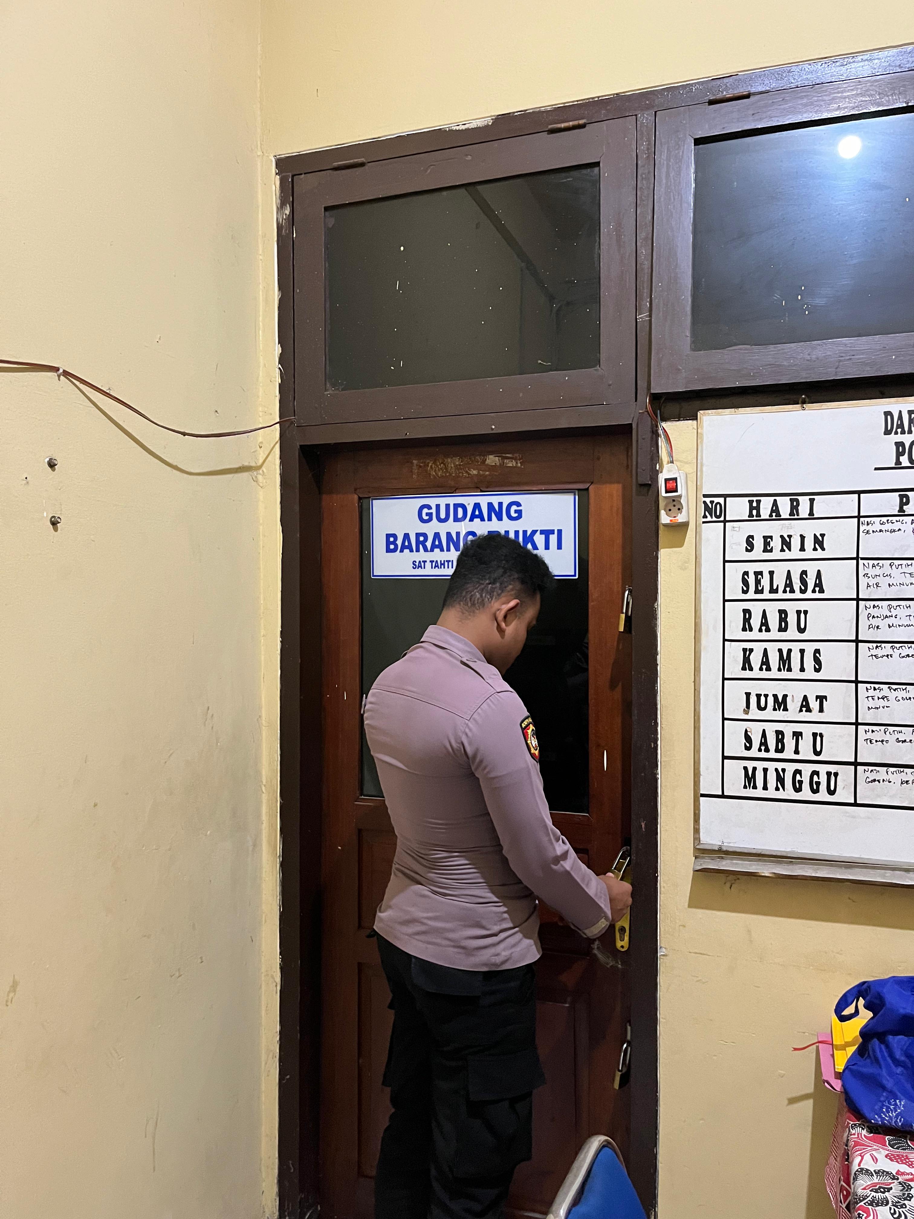 Cilegon, Polres Cilegon Polda Banten. Di gudang barang bukti Polres Cilegon. Anggota SatTahti polres cilegon mengecek gudang barang bukti untuk menjaga kelengkapan barang bukti. (08/02/2026)