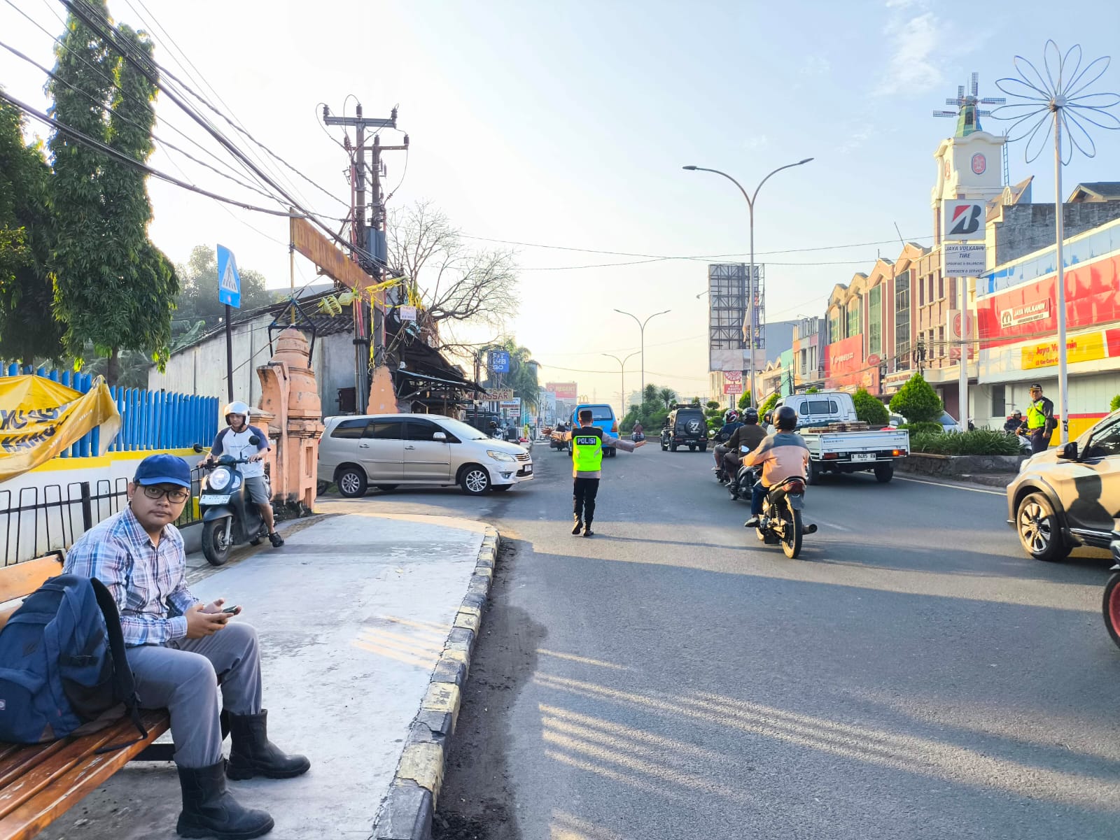 sudrajat melaksanakan kegiatan pengaturan arus lalu lintas di Jalur Protokol jalan utama Kota Cilegon tepat nya di jalur protokol Kota