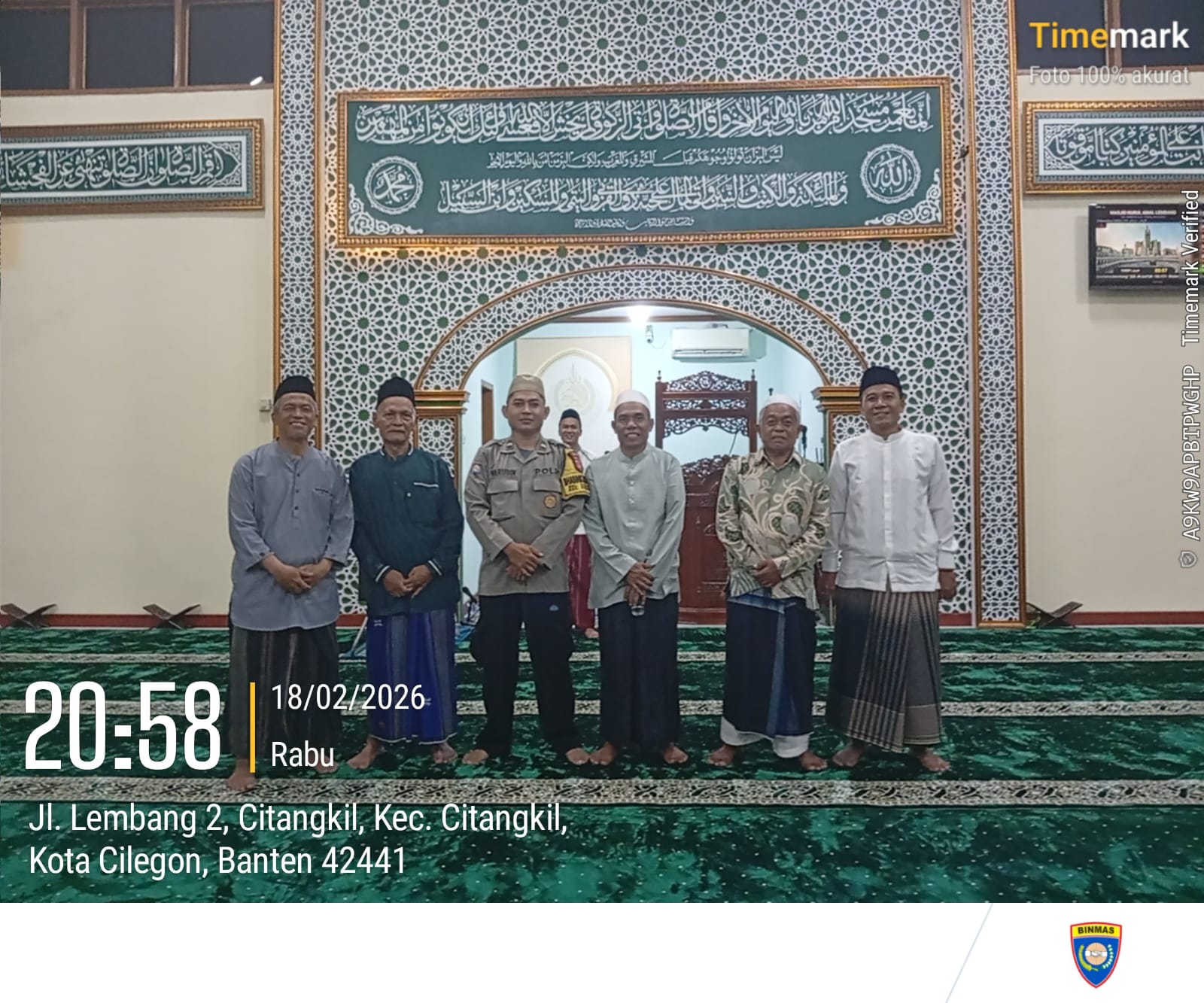 Cilegon - Bhabinkamtibmas polsek Ciwandan Polres Cilegon Polda Banten Silahturahmi Dan Tarawih Keliling Bersama warga Masyarakat lingkungan yang bertempat di masjid lingkungan binaannya, Kamis (19/02/2026).