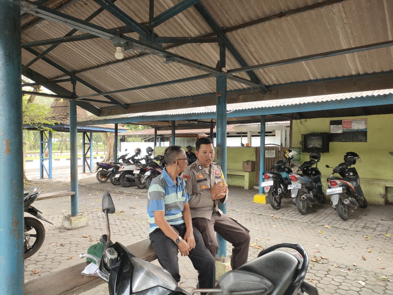Bripka Agustoni, Bhabinkamtibmas Polsek Purwakarta, melakukan kunjungan dan penyambutan kepada pengemudi ojek pada pangkalan di kawasan Propelat Komplek Perumahan KS, Kelurahan Kotabumi, Kecamatan Purwakarta Kota, Cilegon.