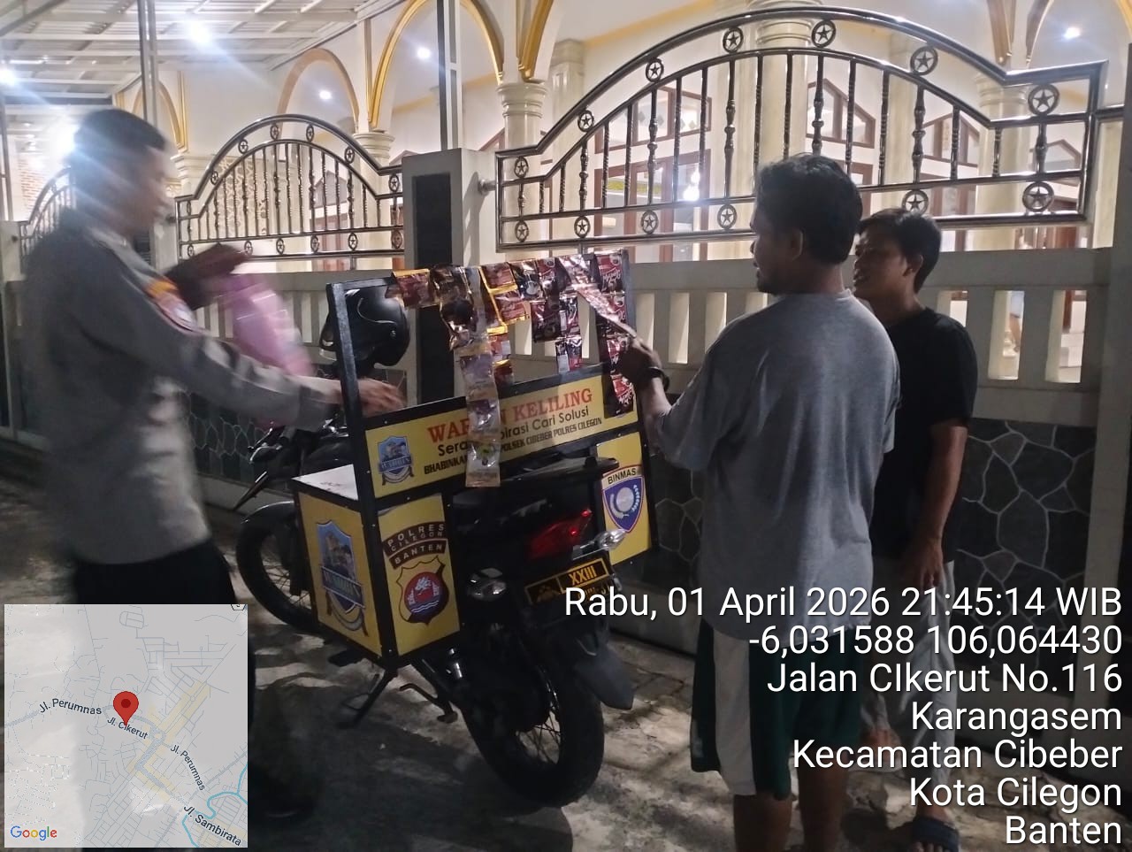 Cilegon – Polres Cilegon Polda Banten, Bhabinkamtibmas Polsek Cibeber Polres Cilegon melaksanakan kegiatan sambang kamtibmas silaturahmi implementasi Commander Wish Kapolda Banten "WARBINLING" Warung Bhabinkamtibmas Keliling dan Program Commanderwish Kapolres Cilegon "TRENDING" dalam rangka menciptakan situasi aman dan kondusif di daerah hukum Polsek Cibeber Polres Cilegon, Rabu (01/04/2026).