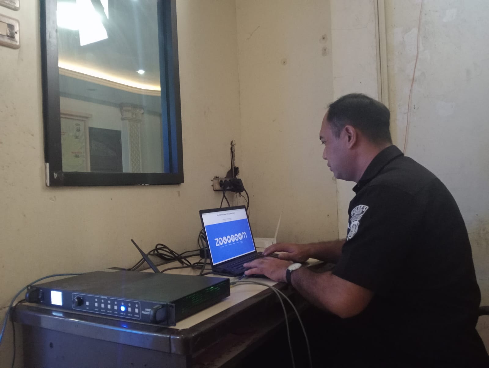Anggota Tik Polres Cilegon Menyiapkan Sarana dan Prasarana Untuk Kegiatan Zoom meeting Dalam pelaksanaan kegiatan zoom meeting tersebut anggota TIK Polres Cilegon yang bertanggung jawab untuk menyiapkan peralatan zoom. Selain itu agar di tidak ada gangguan jaringan sebelum pelaksanaan anggota TIK melakukan pemeriksaan terhadap sarana dan prasarana tersebut . Satu jam sebelum kegiatan zoom meeting itu dimulai. Kapolres Cilegon AKBP. DR. MARTUA RAJA TARIPAR LAUT SILITONGA. melalui Kasi TIK AIPTU Suwanto, S.H. menyampaikan bahwa “untuk menunjang kelancaran penyampaian informasi anggota TIk Polres Cilegon selalu memeriksa sarana dan prasarana tersebut, sebelum maupun pada saat pelaksanaan akan selalu di monitor”