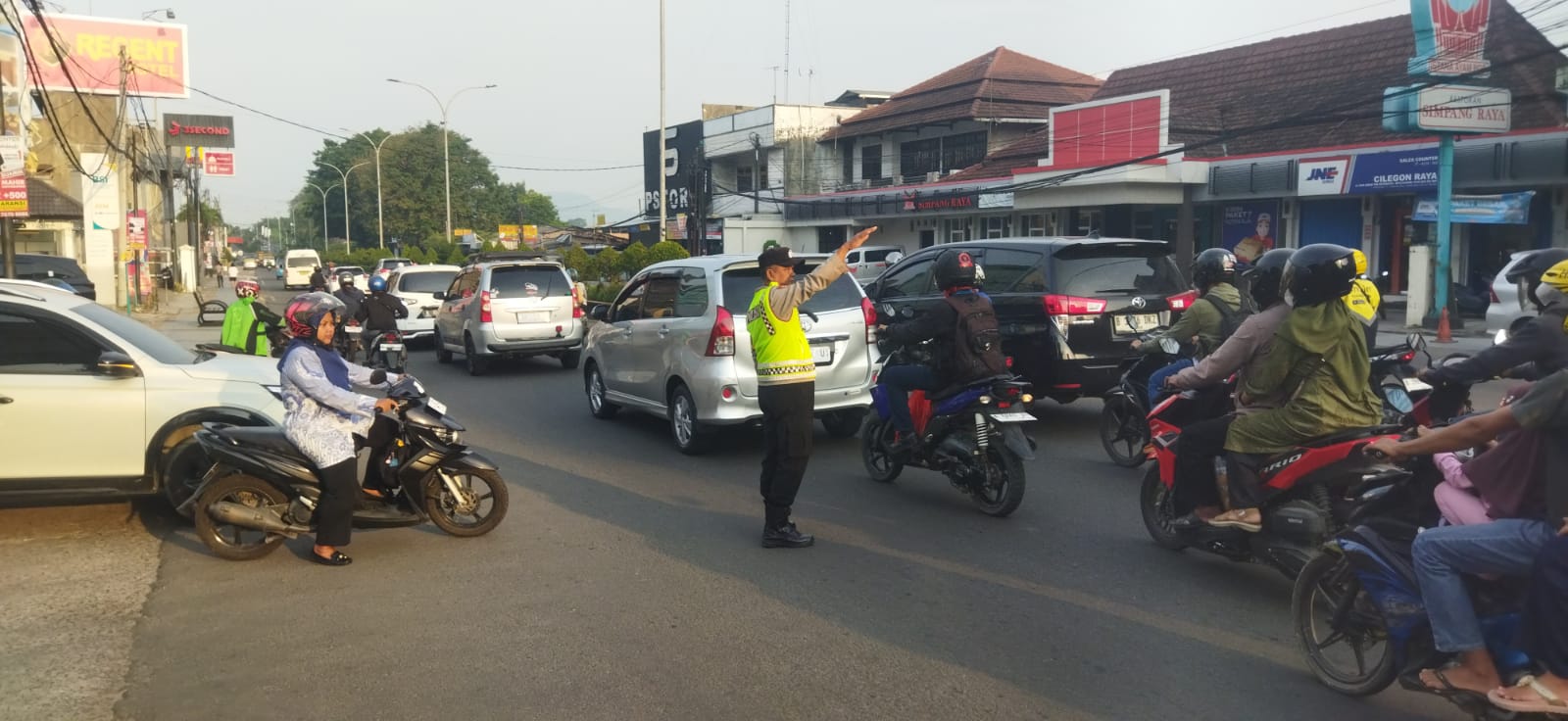kepolisian tampak sigap mengatur arus kendaraan roda dua dan roda empat, kehadiran