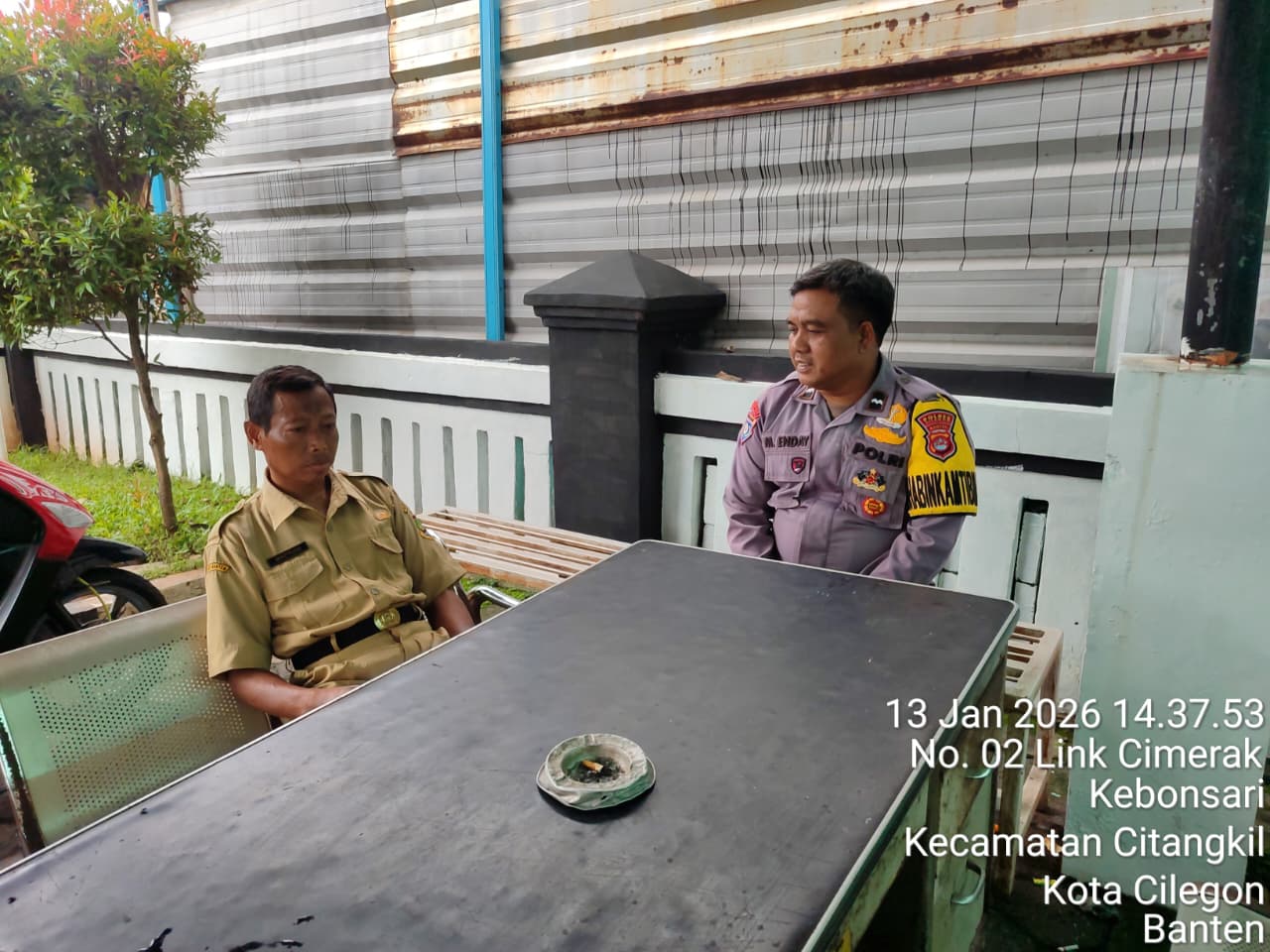 Cilegon - Personil Bhabinkamtibmas Polsek Ciwandan Polres Cilegon Polda Banten Menyampaikan Pesan Kamtibmas dan mengajak masyarakat terus aktif dalam kepedulian terhadap Pemeliharaan keamanan lingkungan di daerah Binaanya, Selasa (13/01/2026).