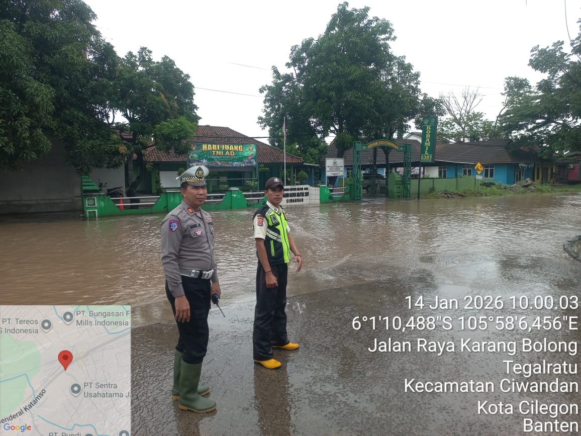 Cilegon - Personil Polsek Ciwandan melaksanakan monitoring genangan air dampak cuaca hujan lebat di wilayah hukum Polsek Ciwandan, Rabu (14/01/2026).